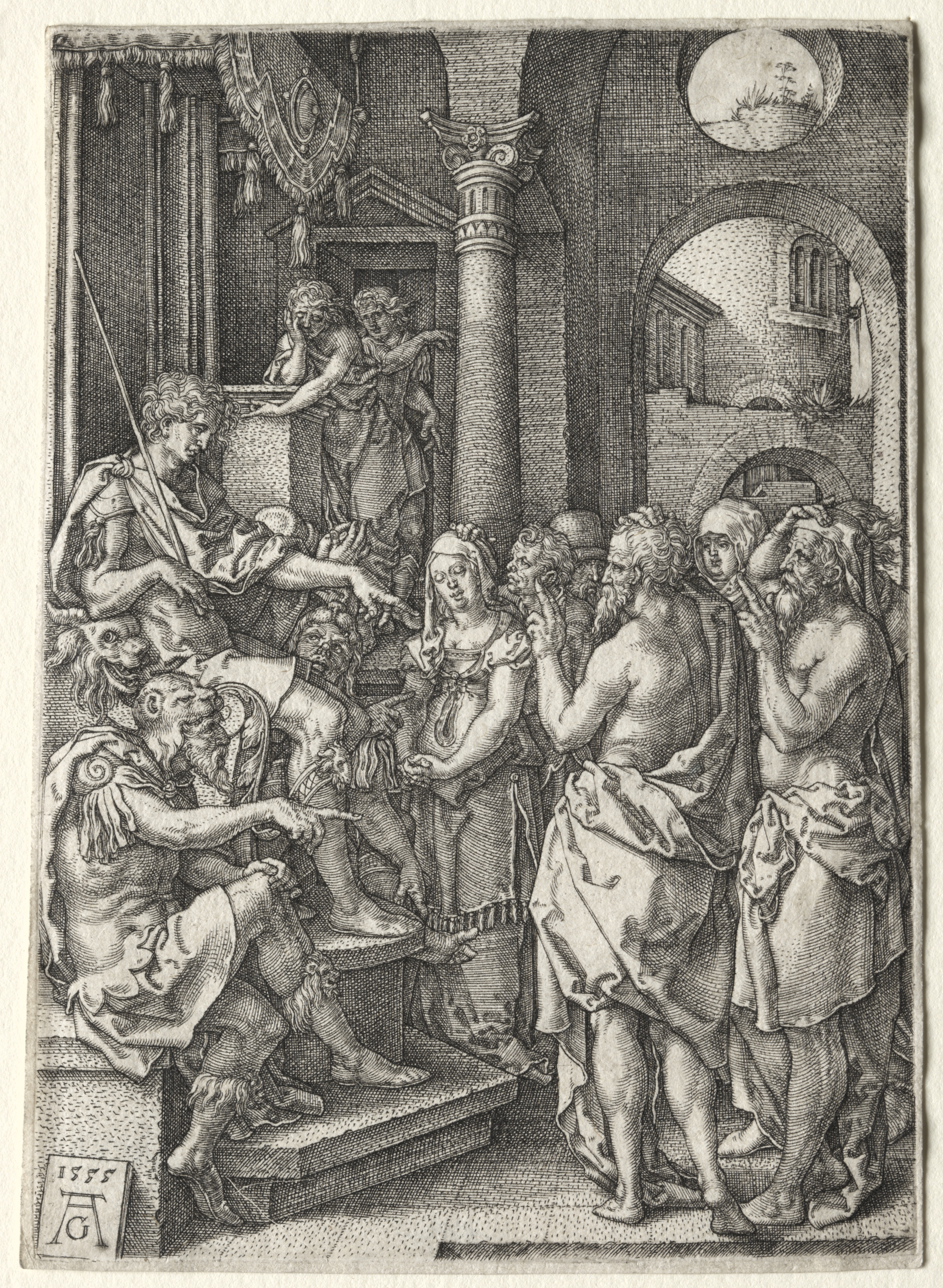Black and white engraving of a scene depicting a group of people in a courtyard setting. A woman stands in the center, surrounded by a crowd of mostly men. Two older, bearded men are positioned to her right, one with his hand on his forehead. A seated man points towards the woman with his right hand. He sits on the left, holding a sword. The woman wears a dress and has her hands clasped. Behind her, two figures interact near a column and archway. The background features a decorative element hanging from the top left, and a circular scene above the archway on the right. A date and initials are in the bottom left corner. The scene shows the woman accused, titled "The Story of Susanna: Susanna Accused of Adultery" by Heinrich Aldegrever.