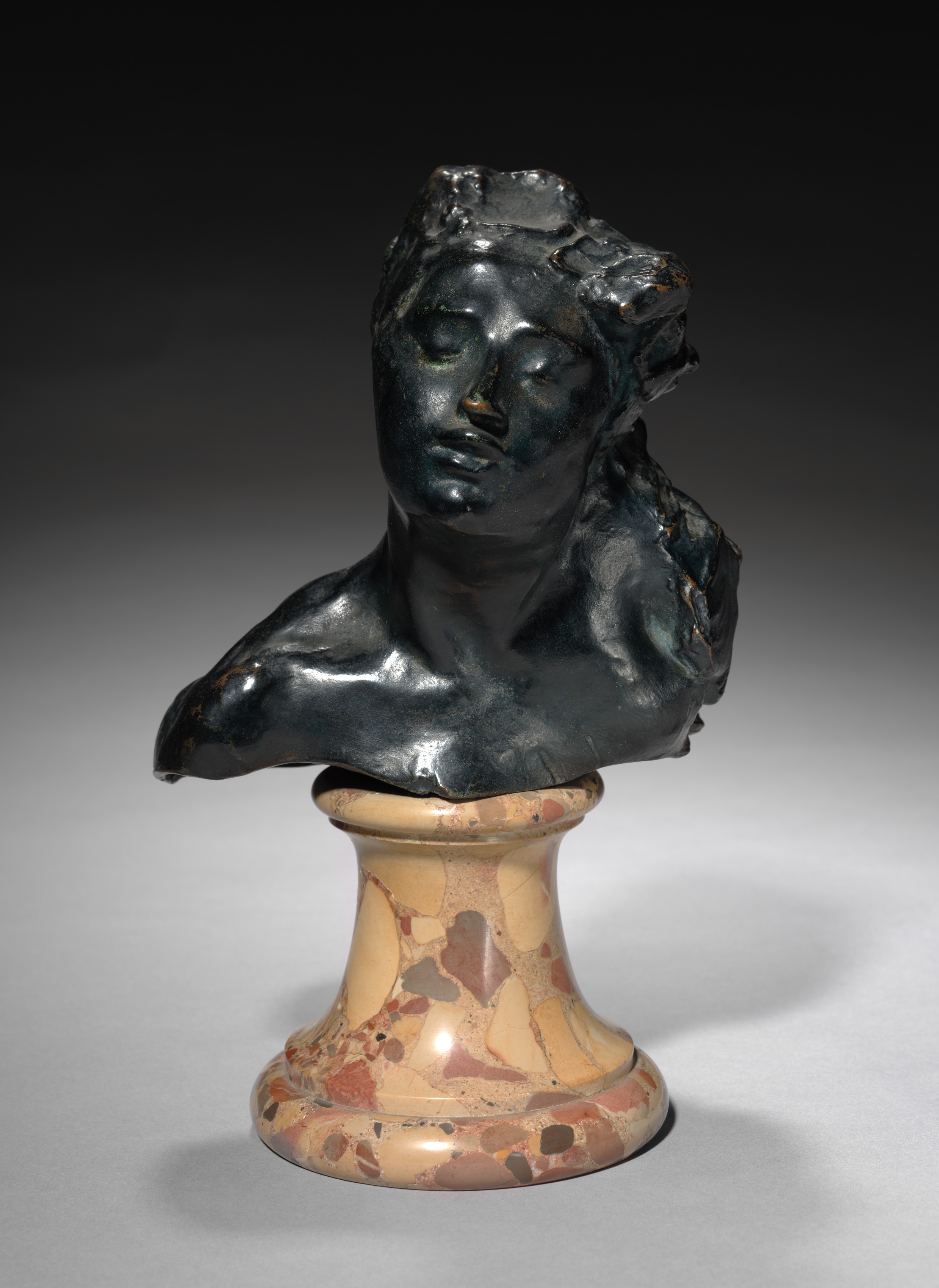 The sculpture depicts a bust of a young person on a stone base. The bust is dark-colored, likely bronze, and shiny, with a smooth and slightly wavy texture. The person's face is angled slightly to their right; they have a slender nose, thin lips, and closed eyes. The eyebrows are not clearly defined. The person's hair appears short and wavy, with texture on top of the head. The shoulders and upper chest are visible, with the left shoulder higher than the right. The base is made of a light-colored stone with reddish-brown spots and streaks. It is shaped like a truncated cone, wider at the bottom than at the top, and has a smooth surface. The background of the image fades from black at the top to light gray at the bottom.