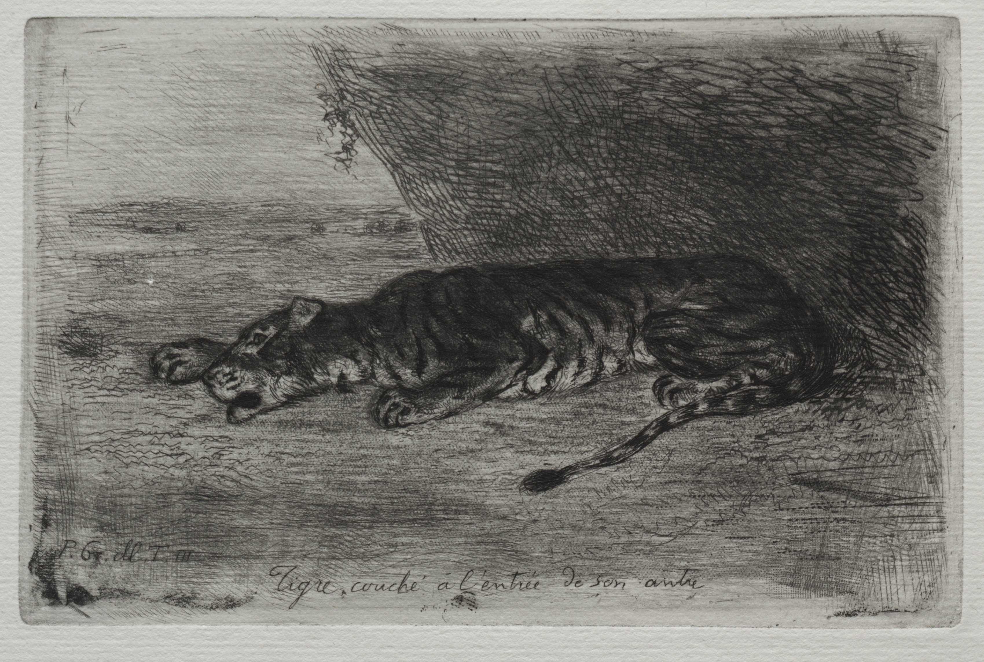 Black and white drawing of a tiger. The tiger is lying down on the left side of the drawing, facing left. Its head is down. The tiger has dark stripes. The background is a cave or rocky area with shading to the right. The drawing has a rough texture. There is writing at the bottom.