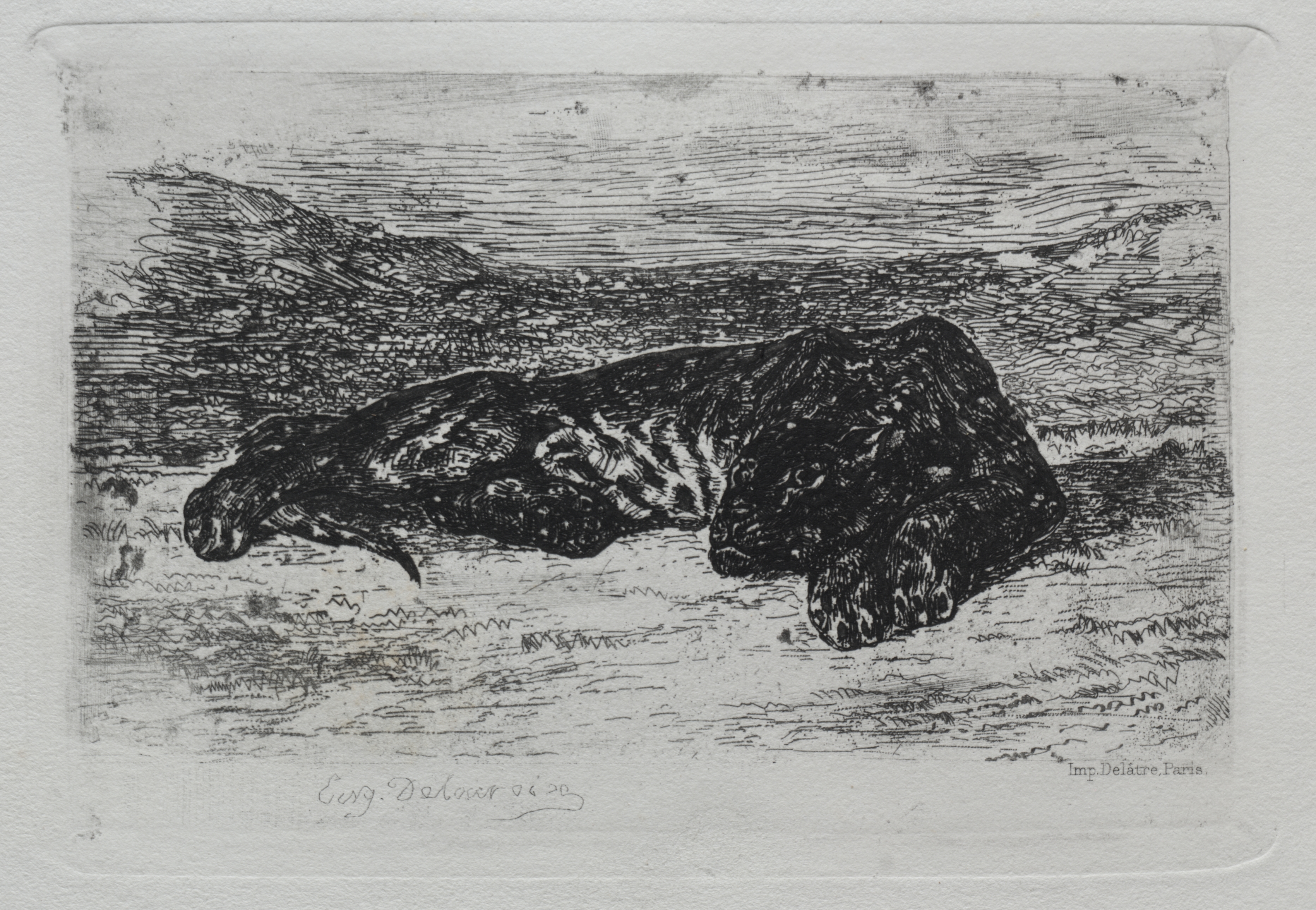 The image depicts a black and white etching of a tiger crouching on the ground. The tiger's body is angled to the left, with its head lowered and tail extended behind it. Its fur is dark with lighter patches. The background features a desert-like landscape with sparse vegetation and a cloudy sky. The artist's signature is visible at the bottom left, and a small text reading "Imp. Delâtre, Paris" is at the bottom right. The etching is set against a white background with a subtle border.