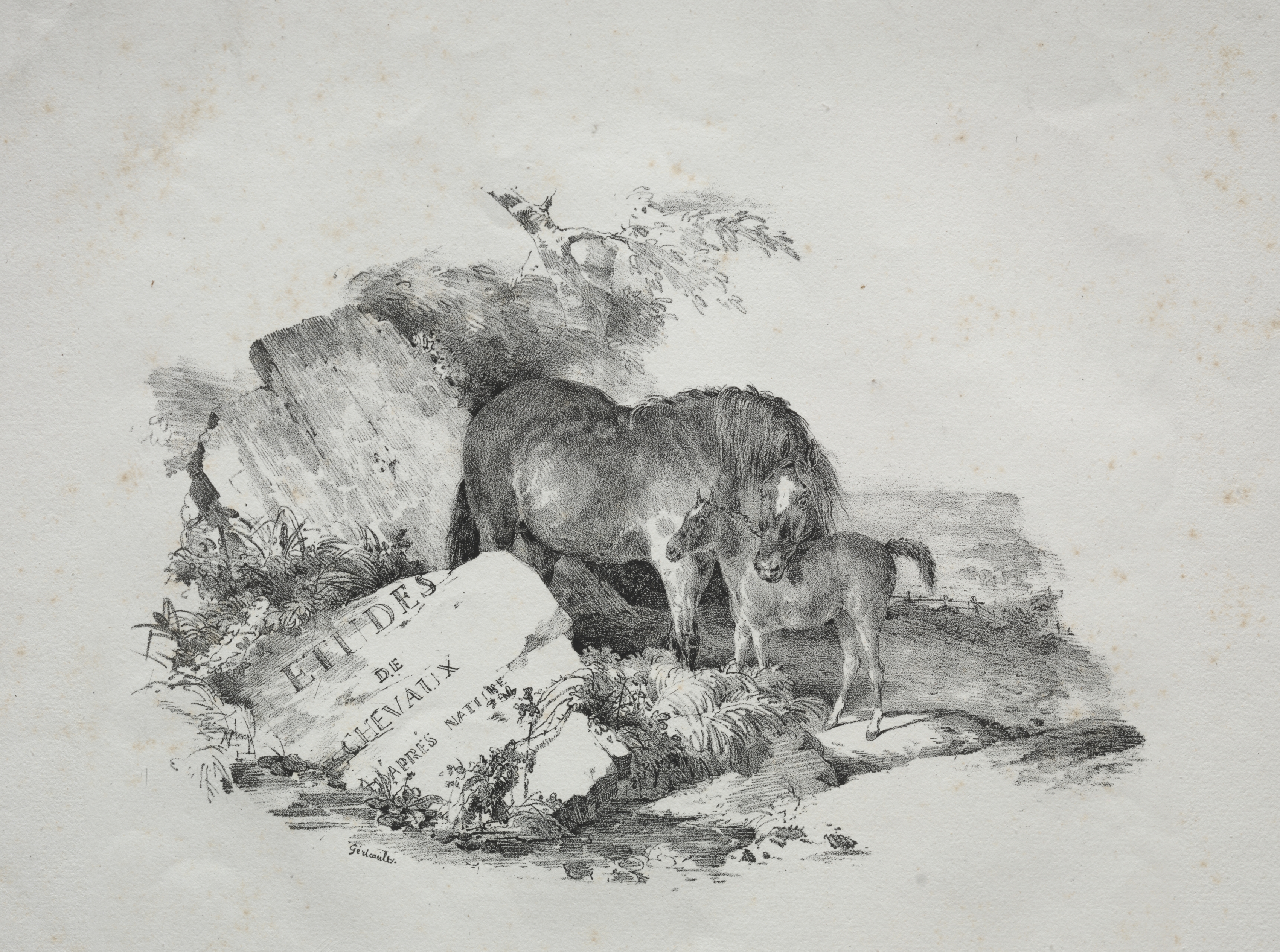 A drawing of a horse and a foal. The adult horse faces towards the right and looks down towards the foal which stands on the right. Both horses are dark brown with white markings. The foal looks up towards the adult horse. A large boulder behind them bears the inscription 'ETUDES DE CHEVAUX APRES NATURE'. A tree branch arcs over the horses. The background shows additional landscape detail including a fence. The paper is discoloured beige with brown spots.