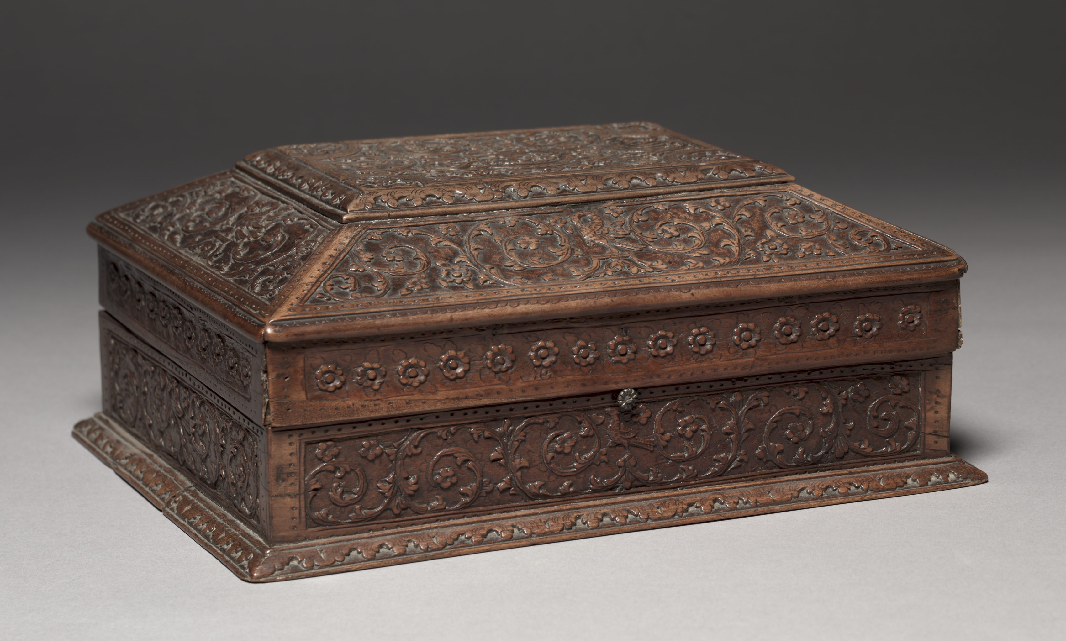 Brown wooden box with a hinged lid, featuring intricate carvings of flowers and vines on all sides, including the top and bottom. The box has a rectangular shape with a flat base and slightly sloping sides. The lid is also rectangular with a slight overhang on all sides. The carvings on the box are ornate and cover the entire surface, with a repeating pattern of flowers and vines. The box is set against a gray background that fades to black at the top. The artist and title of the piece is "Box".