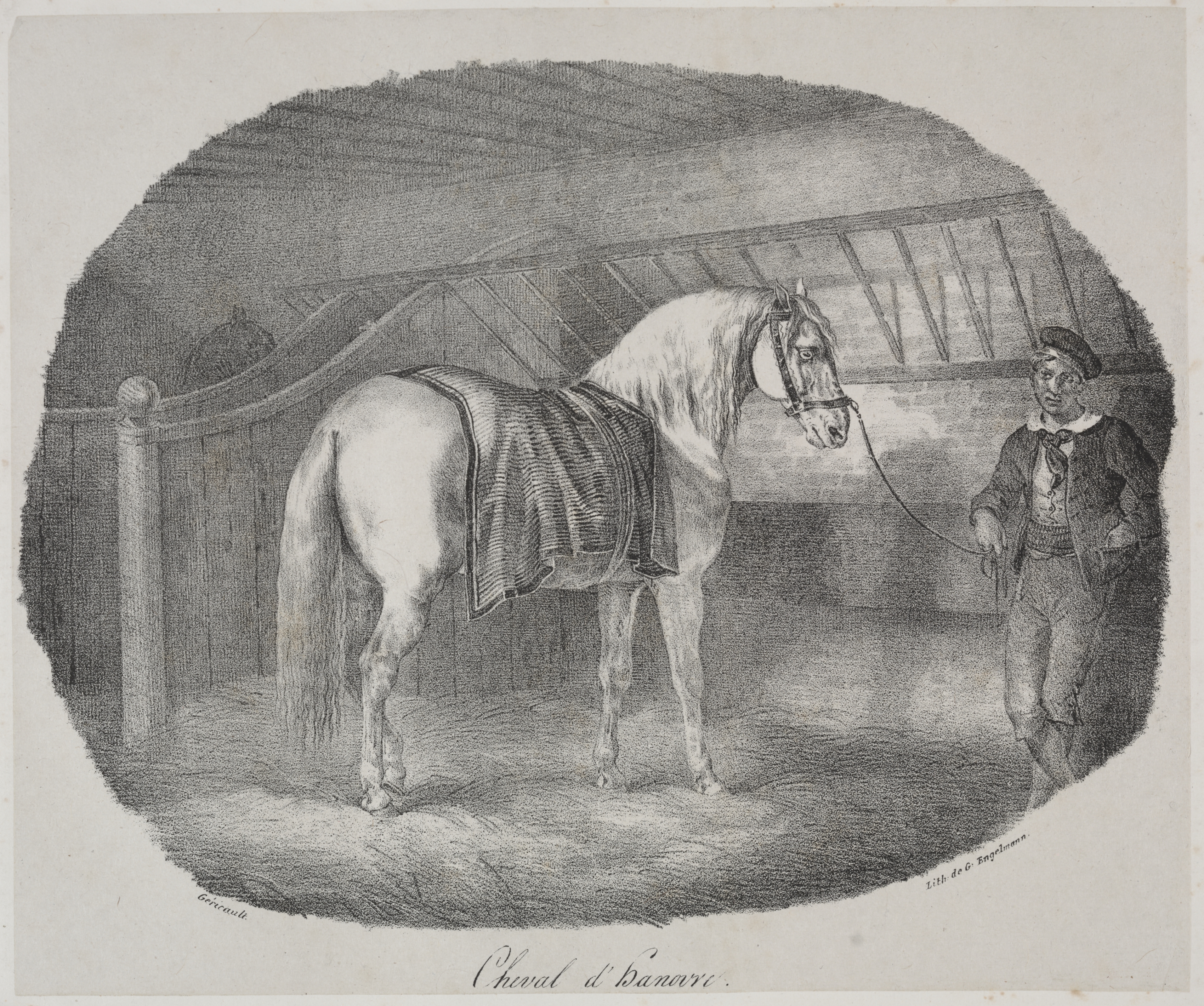 Black and white drawing of a white horse standing in a stable. The horse faces right; it has a bridle on and a blanket on its back. A man with a cap and jacket holds the horse's lead. The image is oval-shaped. The background appears to be a stable with a fence and roof.