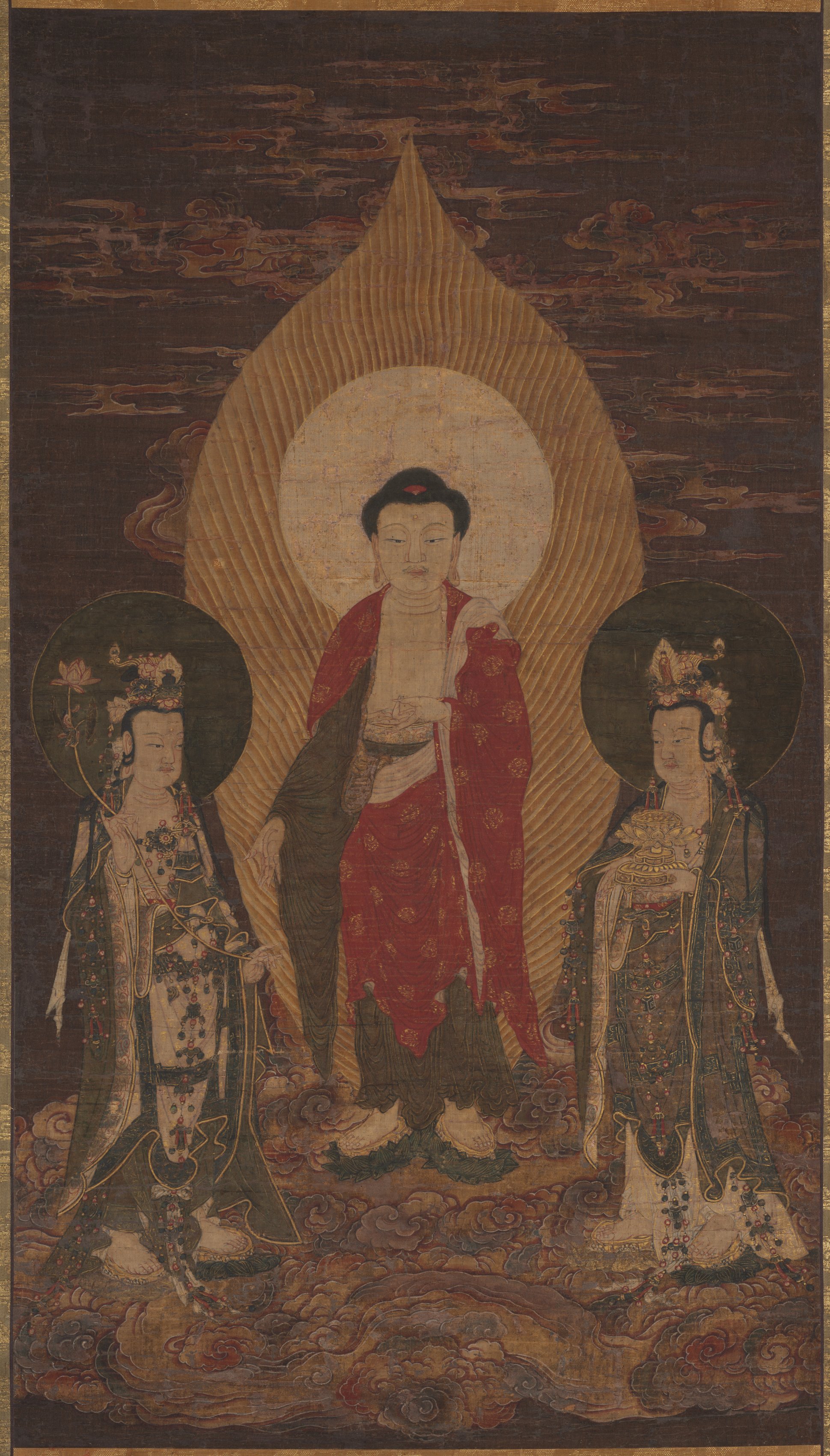 The painting depicts three figures, Amitābha Triad, standing on clouds. The central figure, Amitābha, wears a red robe with gold designs and has a large halo behind him. He stands in front of a large, pointed, gold leaf-shaped design. The two figures on either side of Amitābha are dressed in long, flowing robes with intricate designs. The figure on the left wears a dark green robe with gold trim and a large, round, dark halo behind her. The figure on the right wears a white robe with green and gold trim and a large, round, dark halo behind her. Both figures have elaborate hairpieces on their heads. The background of the painting is dark brown with gold accents, and there are clouds at the bottom of the painting.