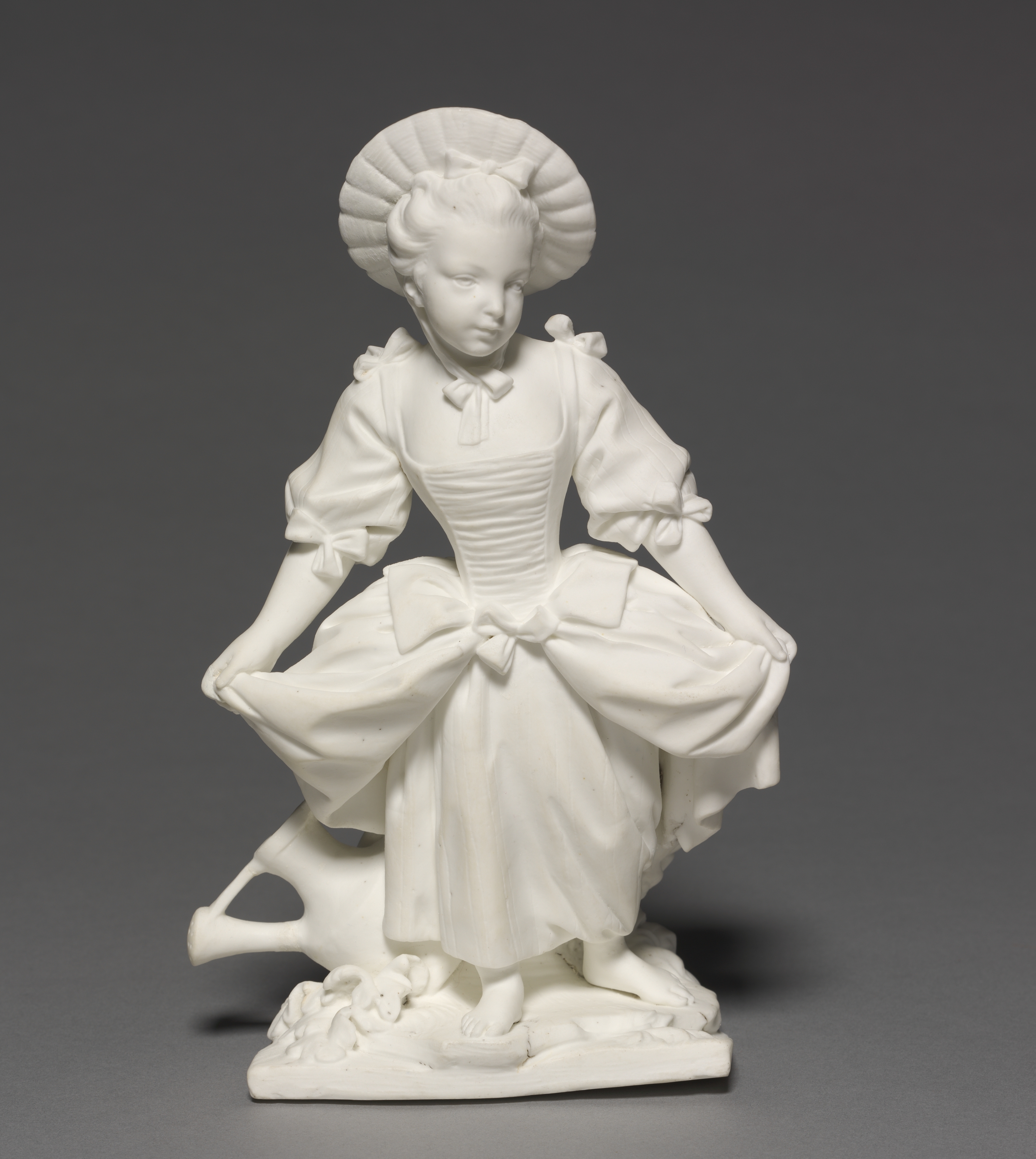 White porcelain figurine of a young girl wearing a large hat and a dress with puffy sleeves and a bow at the waist. The girl is barefoot and appears to be dancing. Her skirt is lifted on one side, and she stands on a base decorated with flowers or foliage. The background of the image is dark gray.