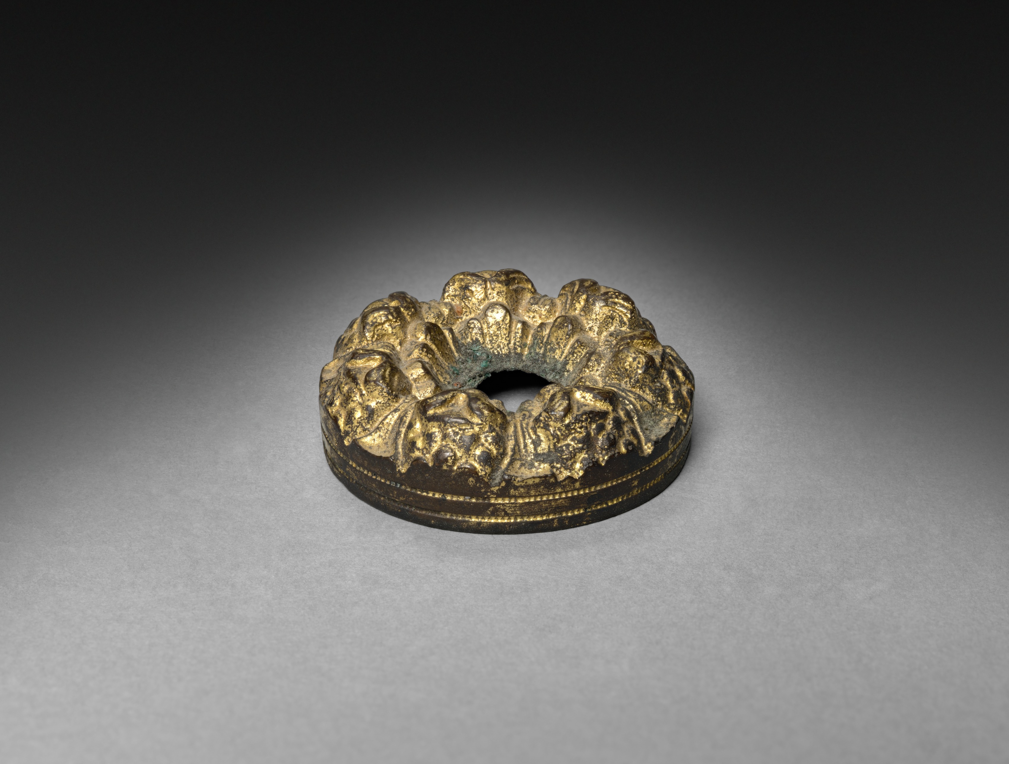 The image depicts a gold-colored metal object with a circular shape and a hole in the center. The object appears to be made of brass or bronze, exhibiting a dark brown base color with gold accents. The object's top features a raised design comprising multiple figures, possibly lions or other animals, arranged around the circular perimeter. The figures are intricately detailed and appear to be three-dimensional. A thin gold line runs along the bottom edge of the object. The object is set against a gray background that gradually darkens towards the top of the image. The overall appearance suggests that this is an antique or vintage item, possibly used for writing or as an ornamental piece. The title of the image is "Inkwell (top to bottle)" and the artist is not specified.