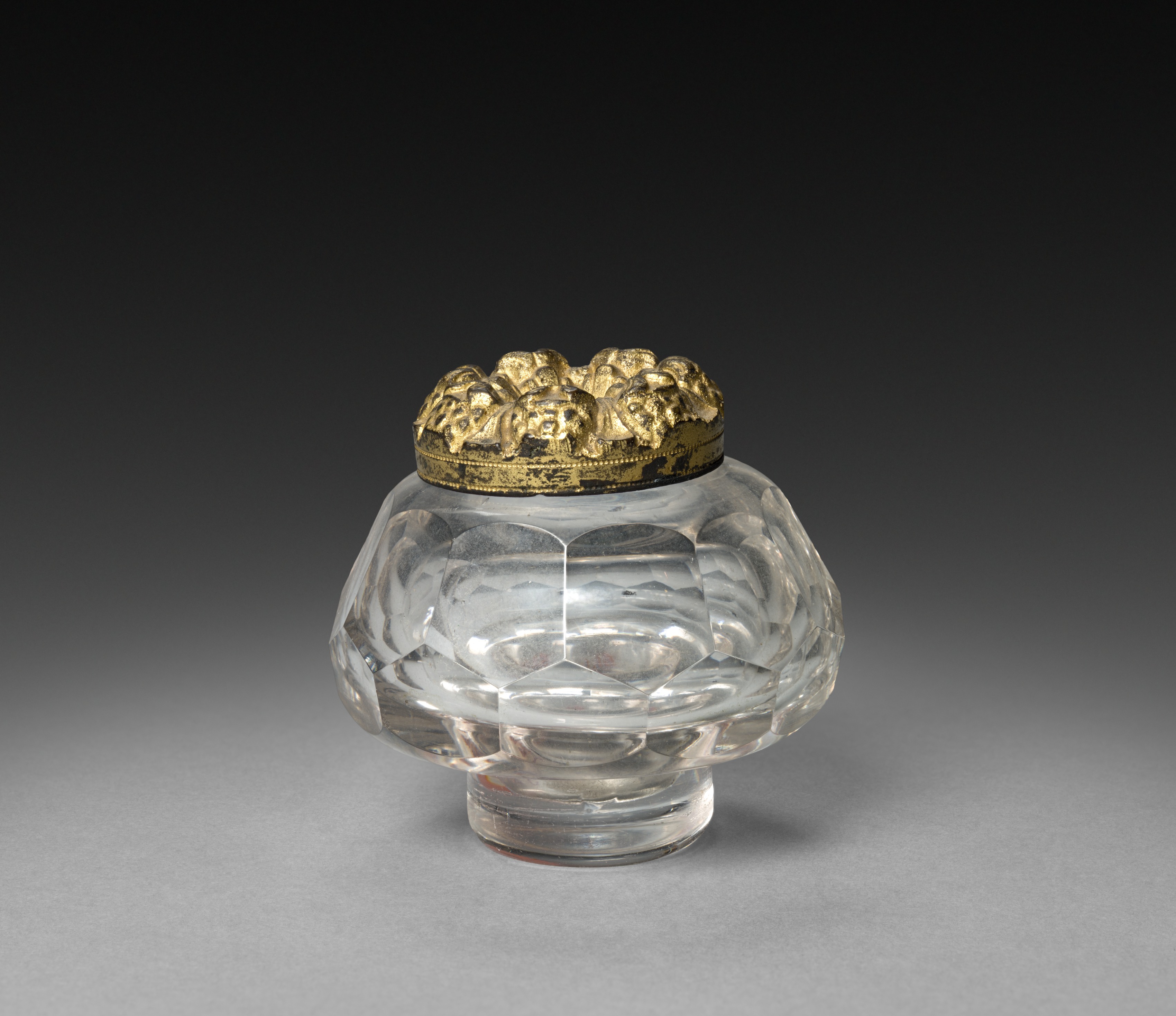 The image depicts a clear glass inkwell titled "Inkwell" by an artist not specified. The glass inkwell is clear and transparent. The body is bulbous with a wide mouth and a narrow base. The shape resembles a rounded bowl with a short cylindrical stem at the bottom. The glass has a faceted design with many flat sides. The lid is made of gold-colored metal, possibly brass or bronze. The lid is ornate with a textured surface featuring raised bumps. The background is dark gray to black, with a lighter gray surface. The object casts a shadow on the surface below.