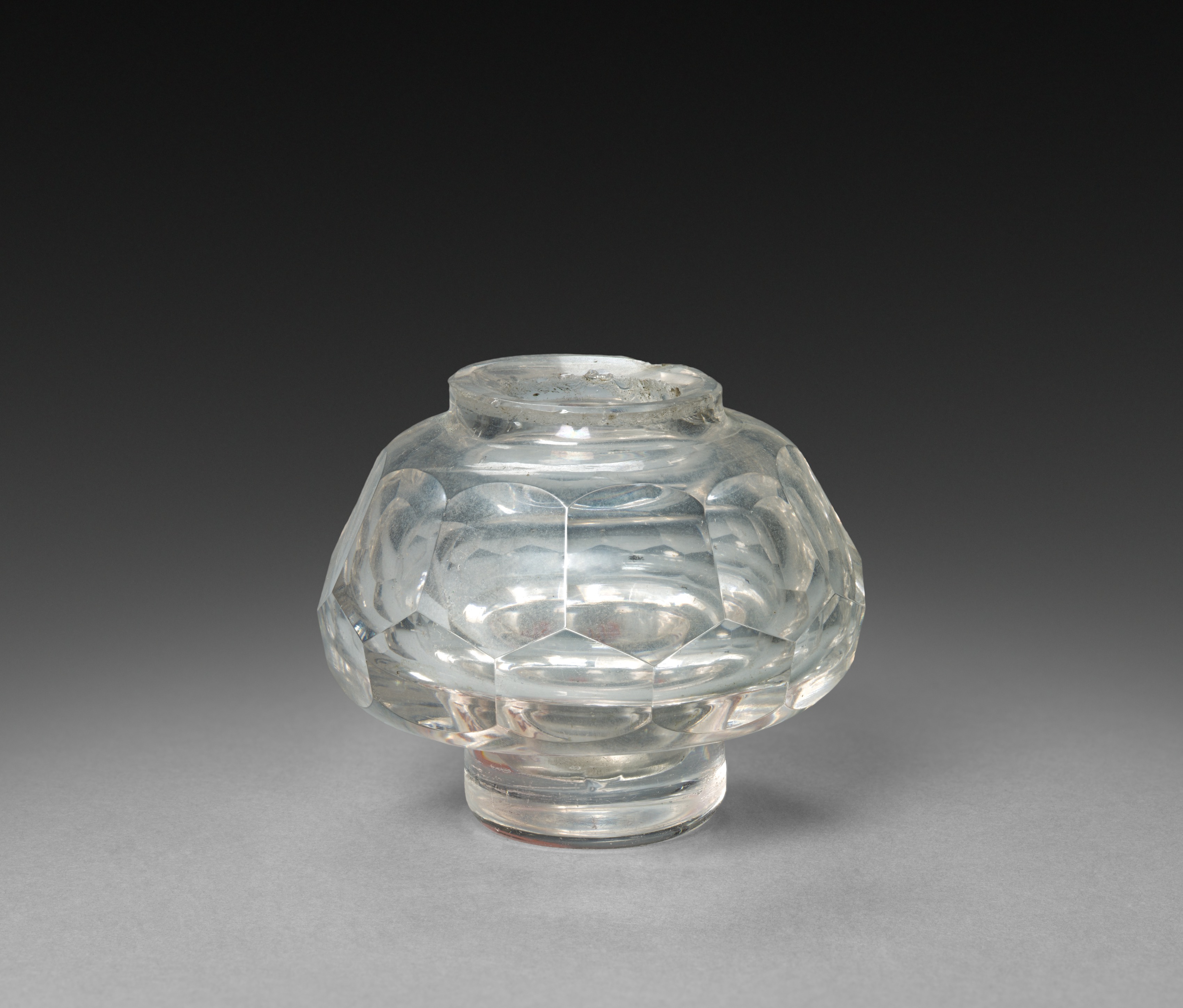 The image shows a clear glass inkwell bottle by Rene Lalique. The bottle is made of clear glass and has a wide, rounded body with a short neck and a small opening at the top. The body is decorated with a faceted design, featuring multiple flat sides that reflect light. The base of the bottle is circular and flat. The background of the image is dark gray, with a lighter gray surface that the bottle is sitting on.