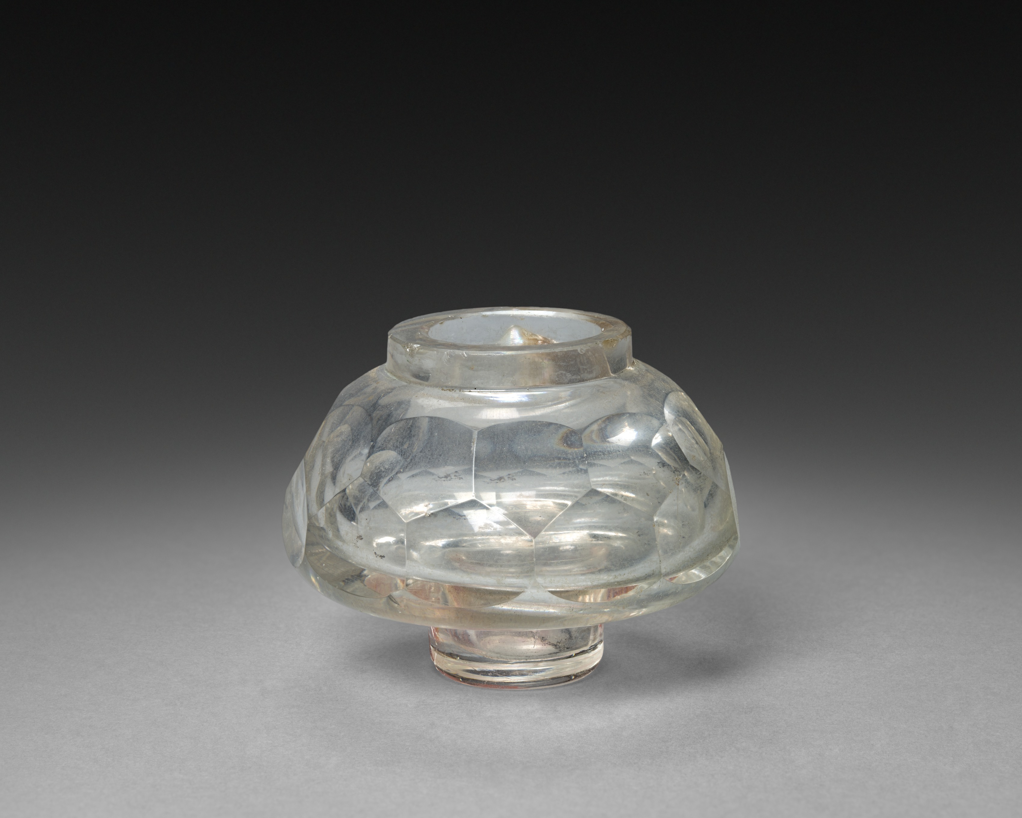The image depicts an inkwell bottle. The object is made of clear glass. It has a wide body with a narrow opening at the top. The body is bulbous with a faceted surface featuring multiple flat sides. The base is short and cylindrical. The background is dark gray at the top and light gray at the bottom with the object casting a shadow.