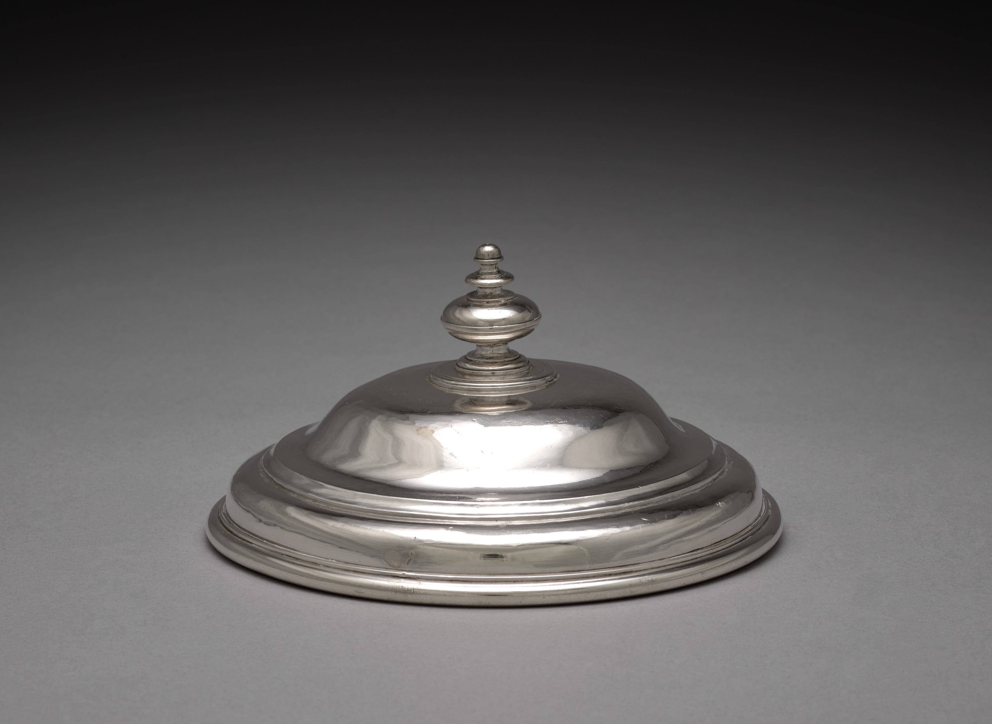 The object is a silver-colored metal lid with a rounded shape. The lid has a small knob on top, which is shaped like a tiny sphere on a short stem. Below the knob is a series of stacked, rounded sections that gradually decrease in size. The main body of the lid is domed and smooth. A wide, flat base with a series of raised rings around its edge. The lid appears to be made of metal, likely silver or silver-plated, and has a shiny finish. The background is a gradient of dark gray to light gray. The artist of this object is Anthony Nelme and the title is "Two-Handled Cup".