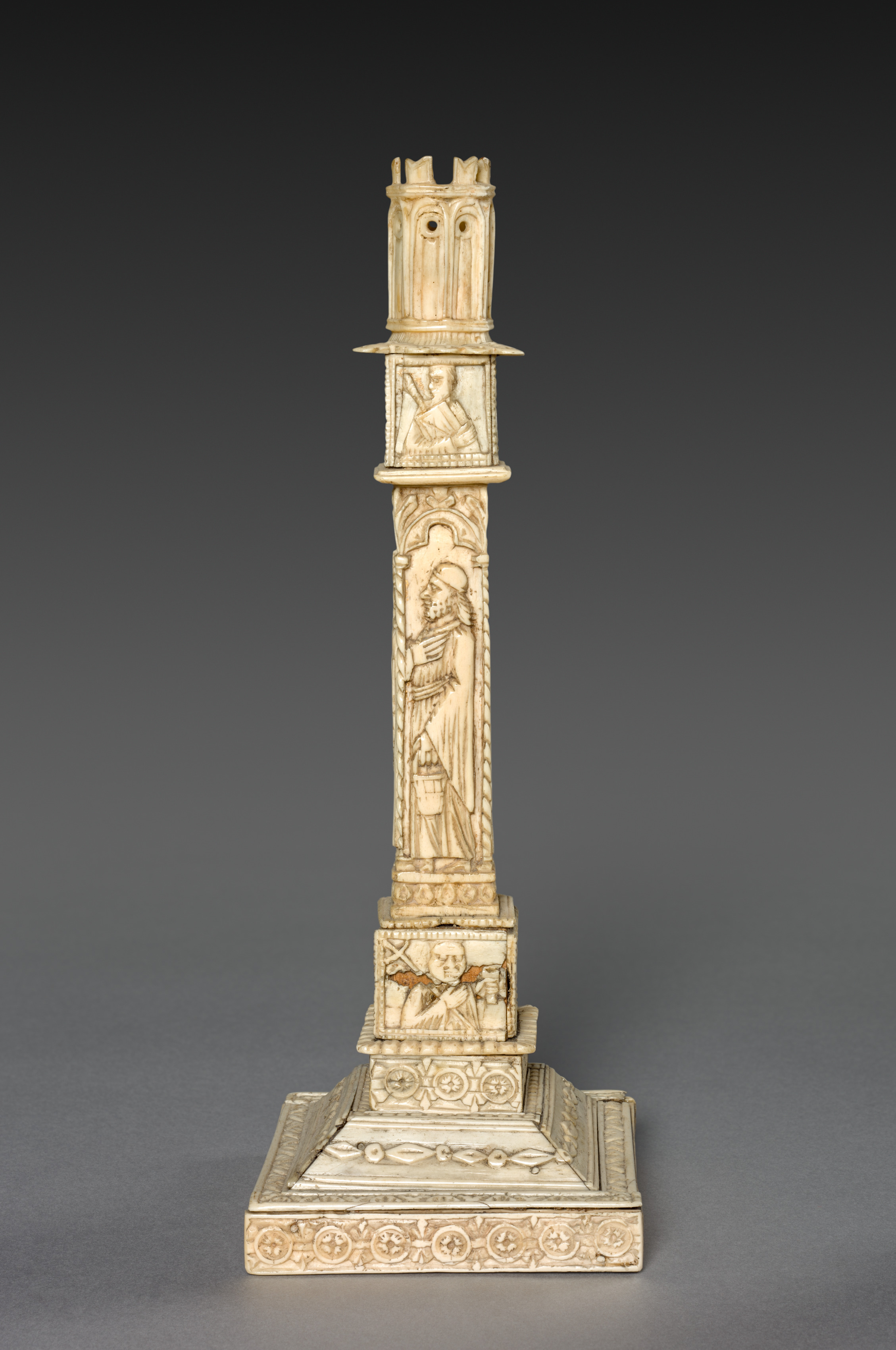 The object is a tall and thin candlestick. The candlestick consists of a square base with a wide lip around the edge. The base supports a stepped square section with a decorative outer edge. Above this are carved birds facing outward on each side. The next section up is a rectangular column with a carved figure on each of the long sides. The figure on one long side holds their hands to their chest and wears a long robe. The figure on the other long side holds a book in one hand and a cylindrical object in the other while wearing a long robe and a rounded hat. Two short sides feature decorative carvings. A short square platform with a lip supports a thin column with a single square panel on one side featuring a seated figure. The top features crenellations with a hole in the center. The object is made of a cream-colored material, likely ivory. The background is dark gray. The object titled "Candlestick" is by the artist.