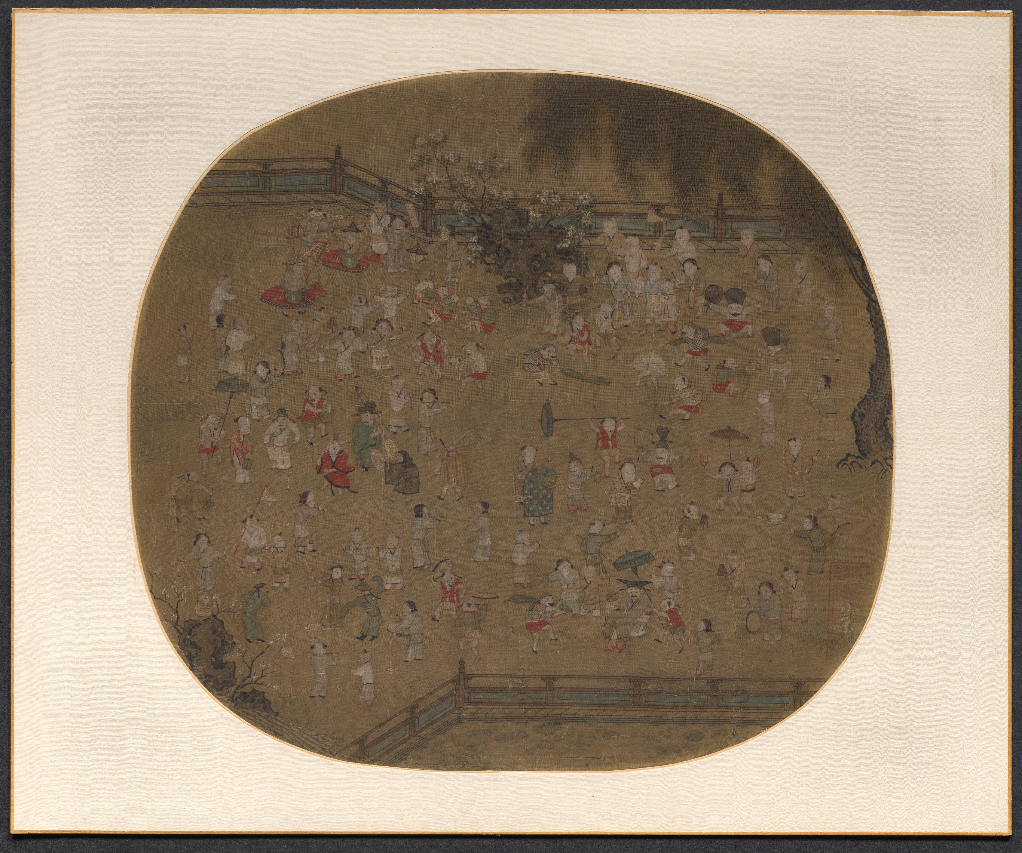 The painting "One Hundred Children at Play" by Su Hanchen depicts a lively scene of numerous children engaged in various playful activities. The artwork features a large, rounded rectangular frame that contains the main scene. The background of the scene is predominantly brown, representing the ground. A low wooden fence encloses the area, with a tree visible in the upper center. The children are dressed in traditional Chinese clothing, predominantly in shades of white, red, and green. They are scattered across the scene, participating in different games and activities. Some children are holding objects such as umbrellas, fans, and toys. The painting is set against a cream-colored background, with a thin black border surrounding it.