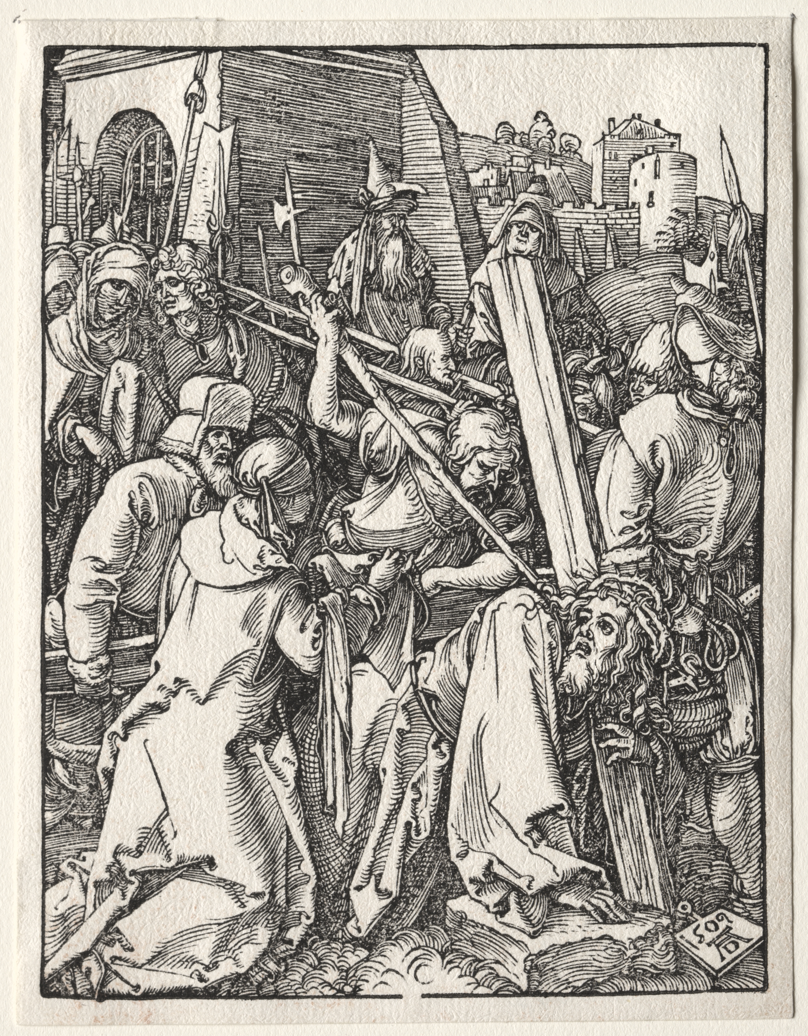 Black and white engraving depicting a man with long curly hair and a beard wearing a robe carrying a large cross. He is surrounded by a crowd of people, some of whom are holding spears. The man with the cross is being assisted by another man as he struggles under the weight. The background shows a cityscape with buildings and a wall. The image has a detailed and intricate style with many lines and textures. The scene appears to be a historical or biblical event. The image is in a rectangular format with a thin border around it. The artwork is attributed to Albrecht Dürer.