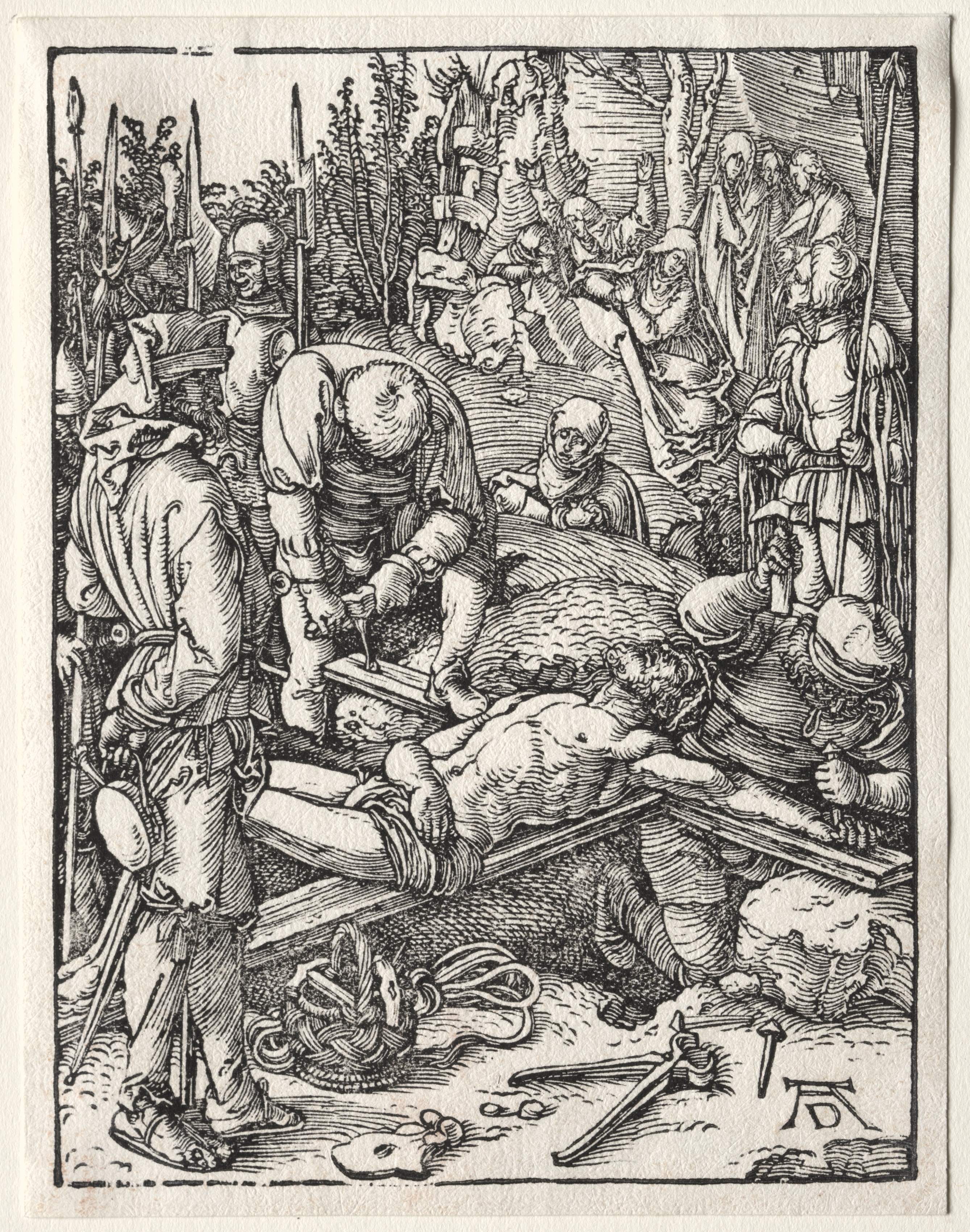 A black and white woodcut print of Christ on a T-shaped beam; Christ's body is naked and his arms are outstretched, his head hangs to one side with eyes closed. A man wearing a cap and apron nails Christ's right hand to the beam. A man wearing full armor stands on the left. A man on the right holds Christ's left hand down on the beam. A crowd of about ten people surrounds the scene; some carry spears and shields. A basket with rope lies on the ground. A sword and tools are scattered on the ground. The image has a black border with a beige background.