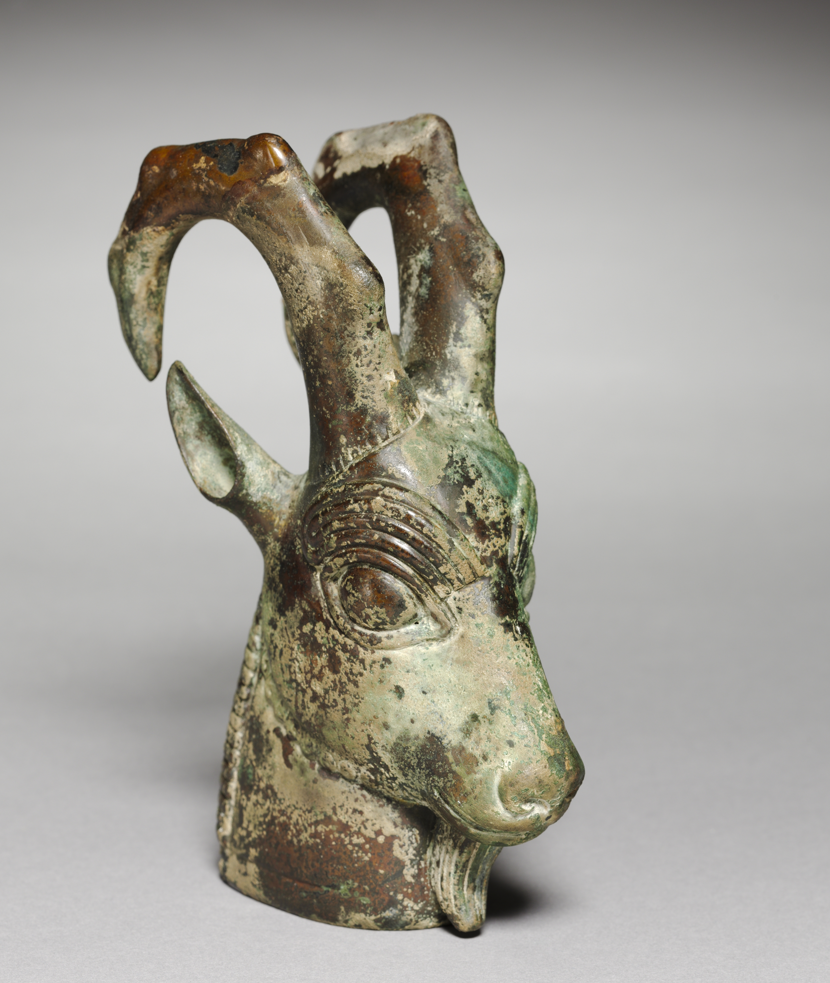 The Ibex-Head Ornament by an unknown artist depicts a weathered bronze or copper alloy object with a green and brown patina. The object is a stylized representation of an ibex's head, featuring curved horns that rise from the top. The head is positioned facing right, with one eye visible and detailed with a carved eyebrow. The mouth is closed, and the object has a rough texture with visible signs of aging and wear. The background is a plain gray color, allowing the object to be the focal point.