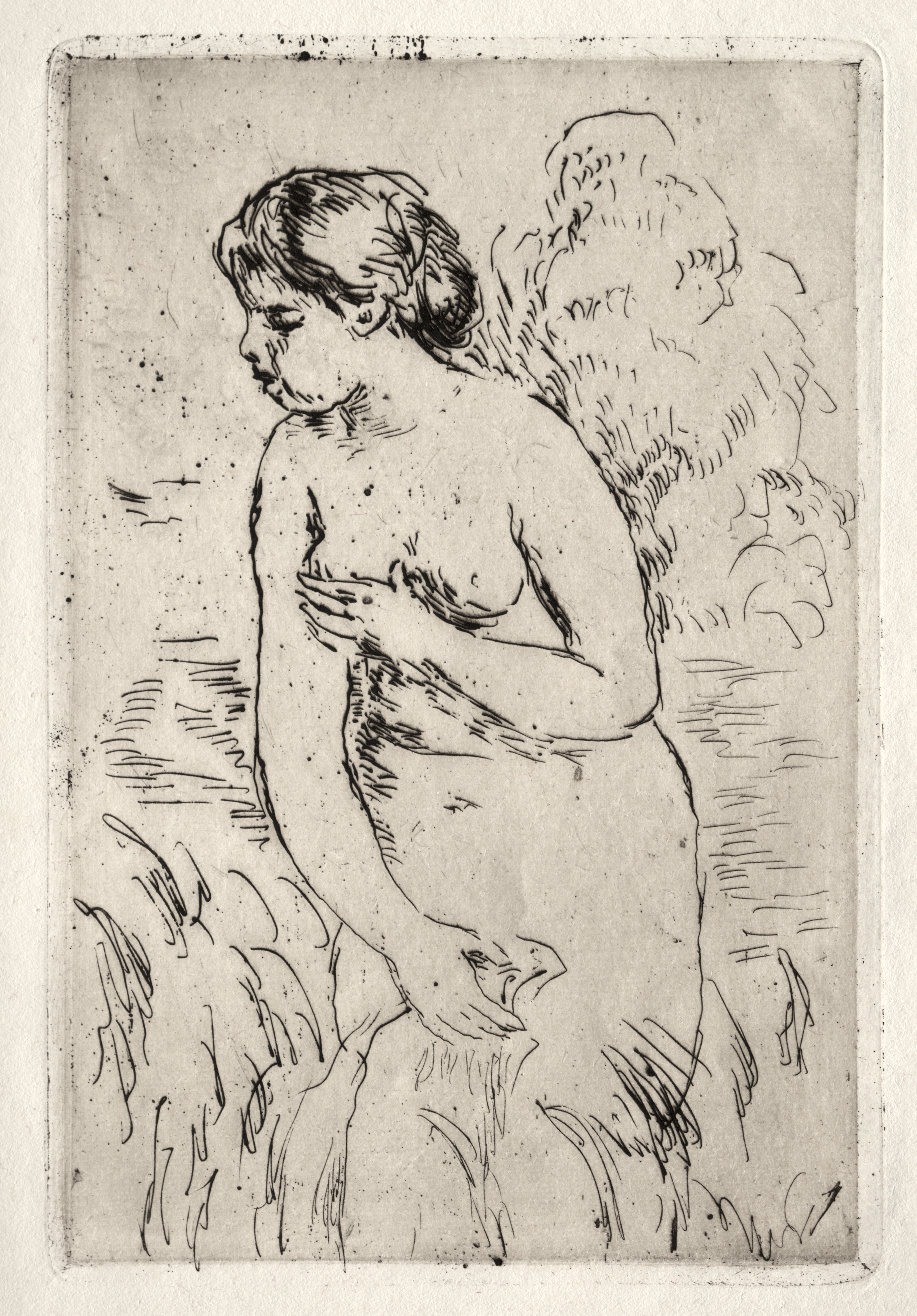A black and white sketch of a woman standing in water up to her knees. The woman has short hair and is viewed from the side, her head turned to the left. She stands with her weight on her right leg and her left leg slightly bent. Her right arm is bent across her body, her left arm not visible. The background shows some indication of water and land. The overall drawing style is expressive with bold, gestural lines. The title of the piece is "Bather Standing Up to Her Knees" and the artist is Pierre-Auguste Renoir.