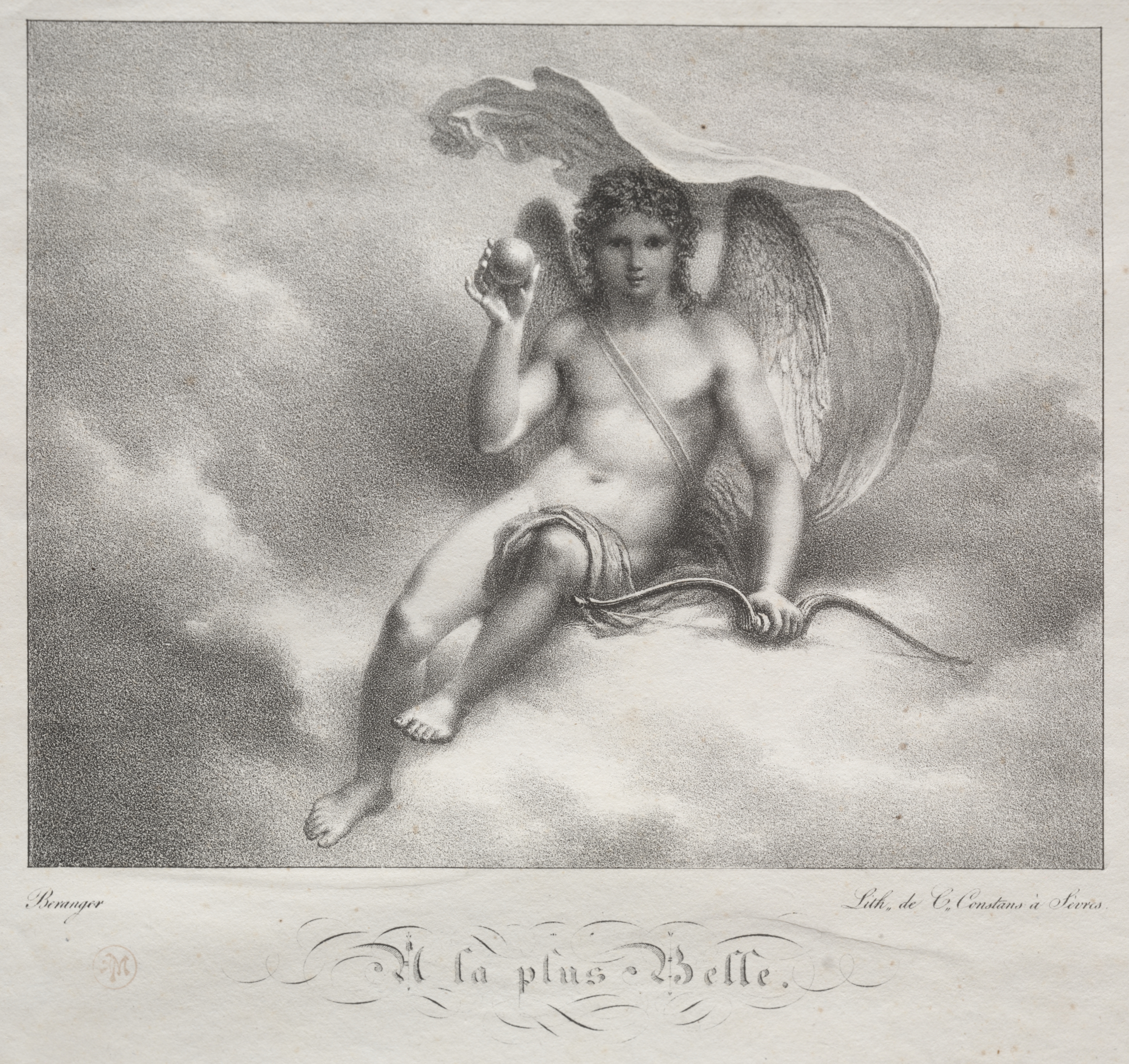Black and white image of a cherub sitting on clouds. The cherub has curly hair and large feathered wings. The cherub is topless and wearing a cloth wrapped around the hips. The cherub is holding an object in the right hand and a bow in the left hand. The bow is resting on the cloud. The text "À la plus belle" is written at the bottom of the image.