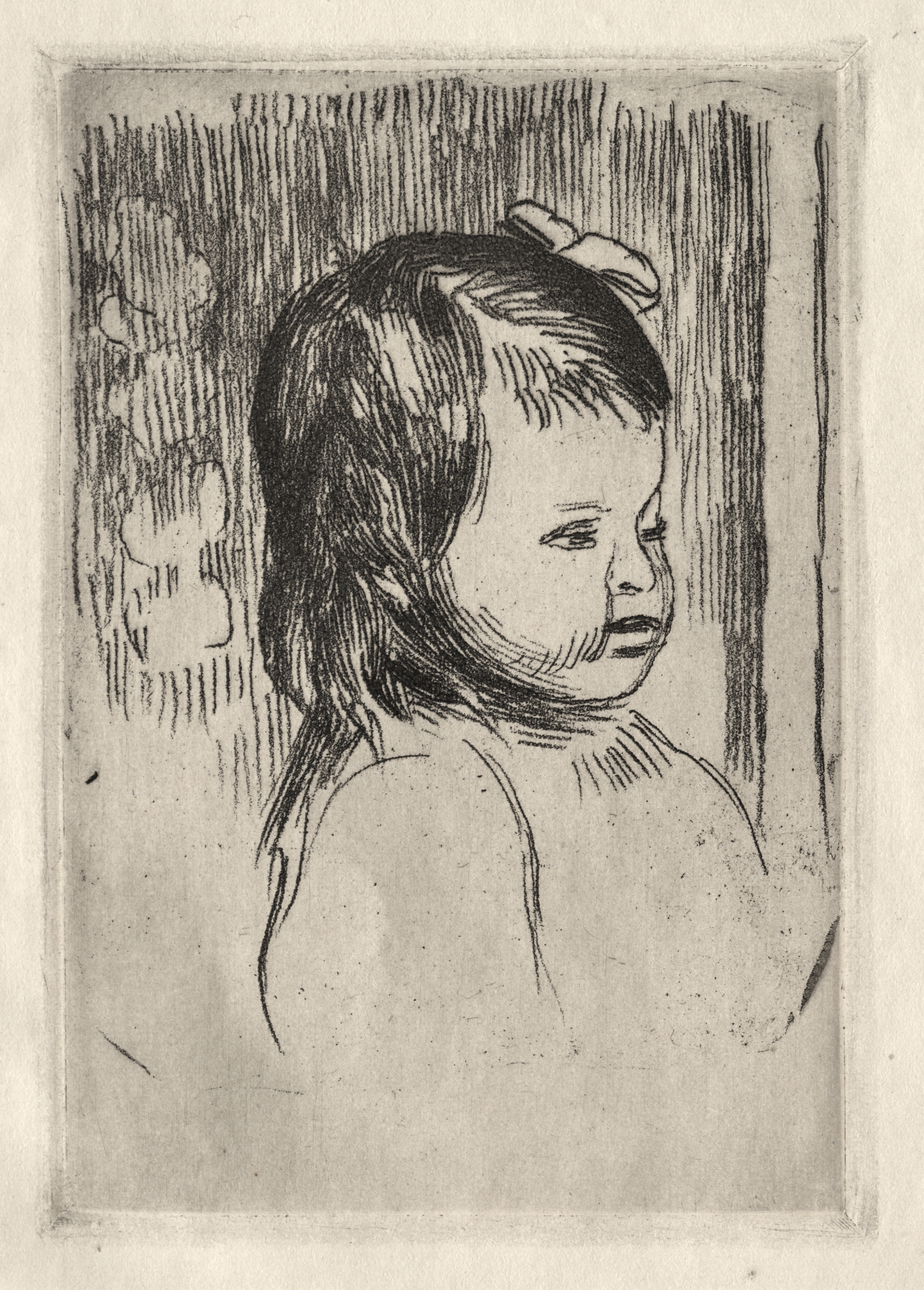 Black and white sketch of a child's upper body. The child has dark hair, parted on the left and tied with a bow at the top. The child faces right, looking slightly down. The child's left shoulder and chest are visible. The background has vertical lines. The image is framed by a rectangle with a lighter border. The artwork is titled "Child's Bust, Turned to the Right" by Pierre-Auguste Renoir.