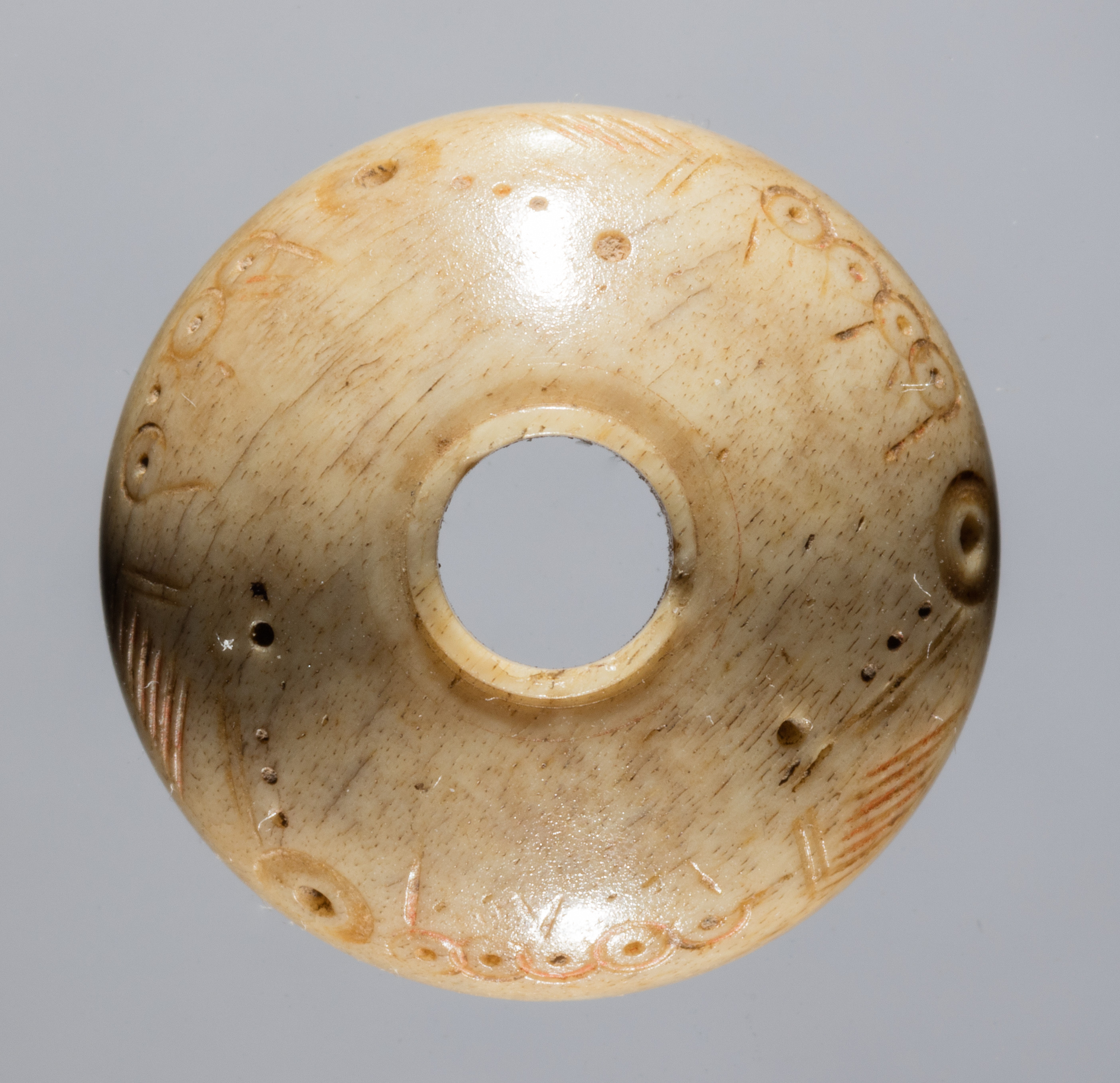 Spindle Whorl by Unknown. A circular object with a hole in the middle. The object is made of light-colored material, possibly stone or bone. It has a smooth surface with visible scratches and marks. The object is decorated with various carved patterns and designs, including lines, dots, and curved shapes. The background of the image is a solid gray color.