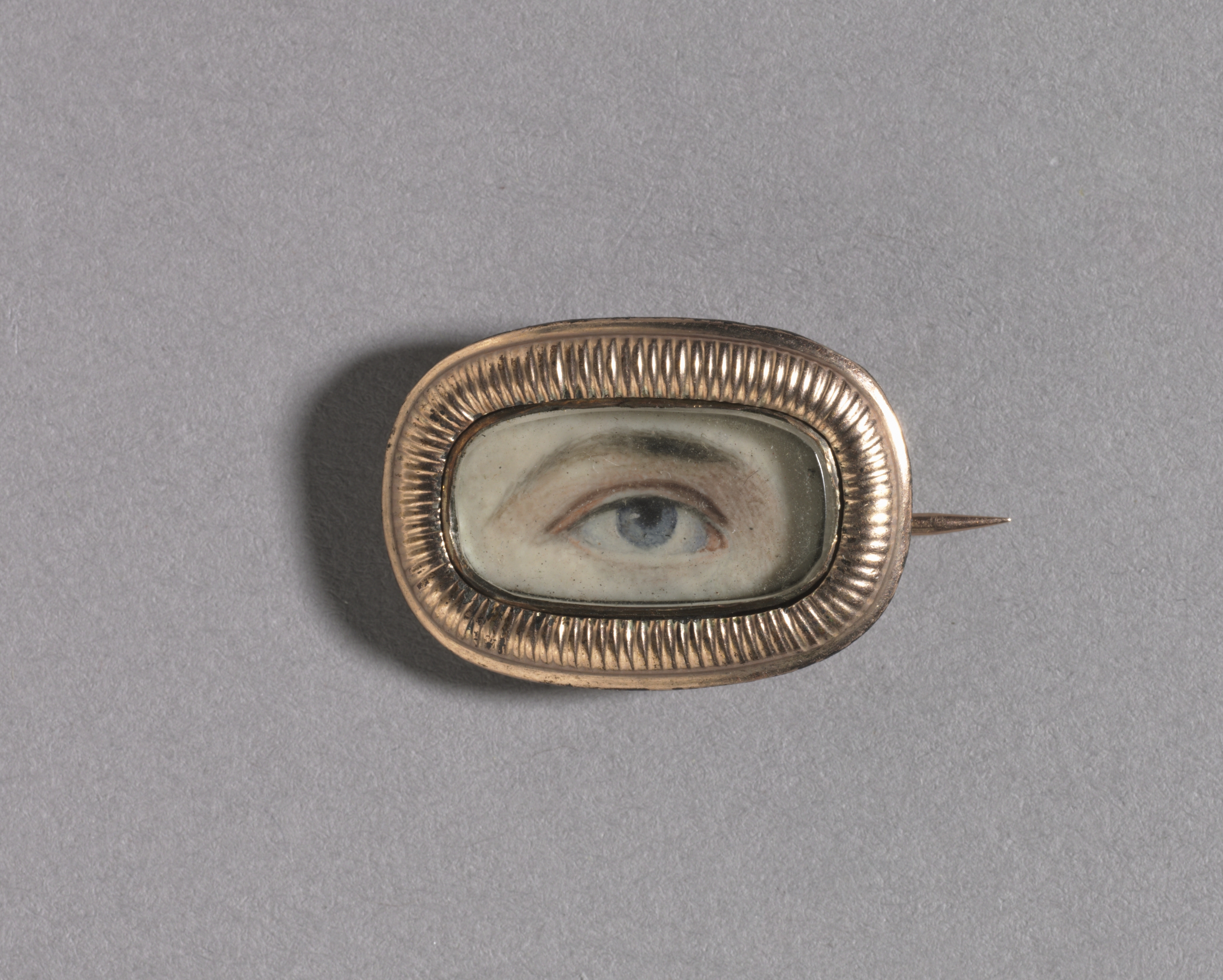 Gold brooch with a rounded rectangular shape. The brooch's border displays a ridged pattern. The brooch features a painted eye. The eye is blue with a brown iris and appears to be human. The eye's gaze is straight ahead. A thin pin protrudes from the side. The brooch is titled "Eye" by artist. The background of the image is gray.