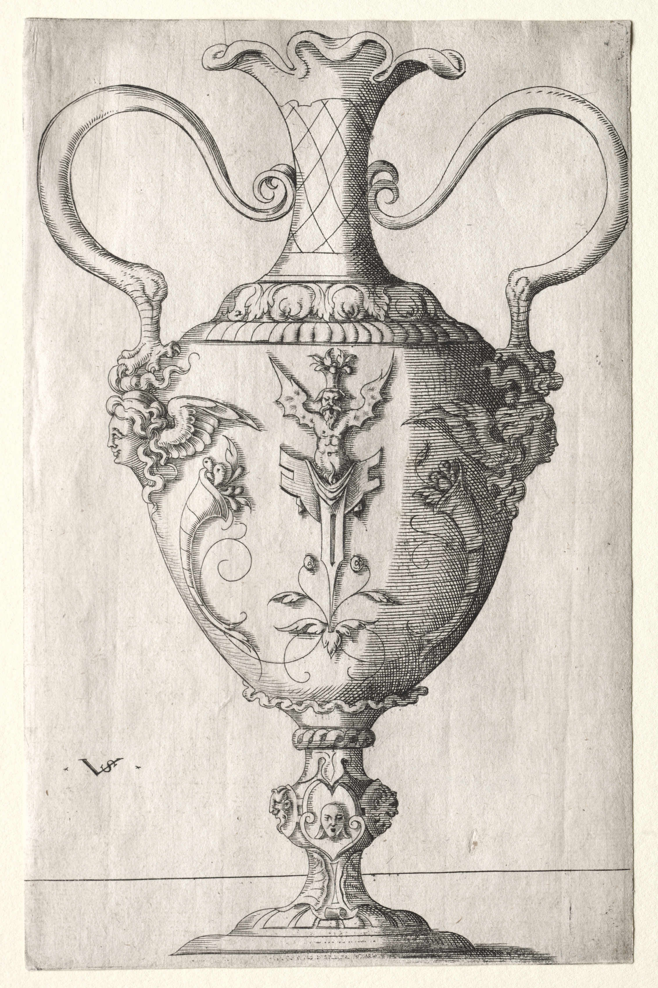 Black and white drawing of a vase by Virgilius Solis. The vase has a narrow base that widens into an urn-shaped body. A stem with a decorative face connects the base to the body. The body has a symmetrical design with two winged creatures on either side. A plant design extends from the bottom to the top center. The top of the vase is flared with two handles on either side curving backward. The handles have decorative ends. The top of the vase is diamond patterned. The background has a light shading effect with a darker line at the bottom.