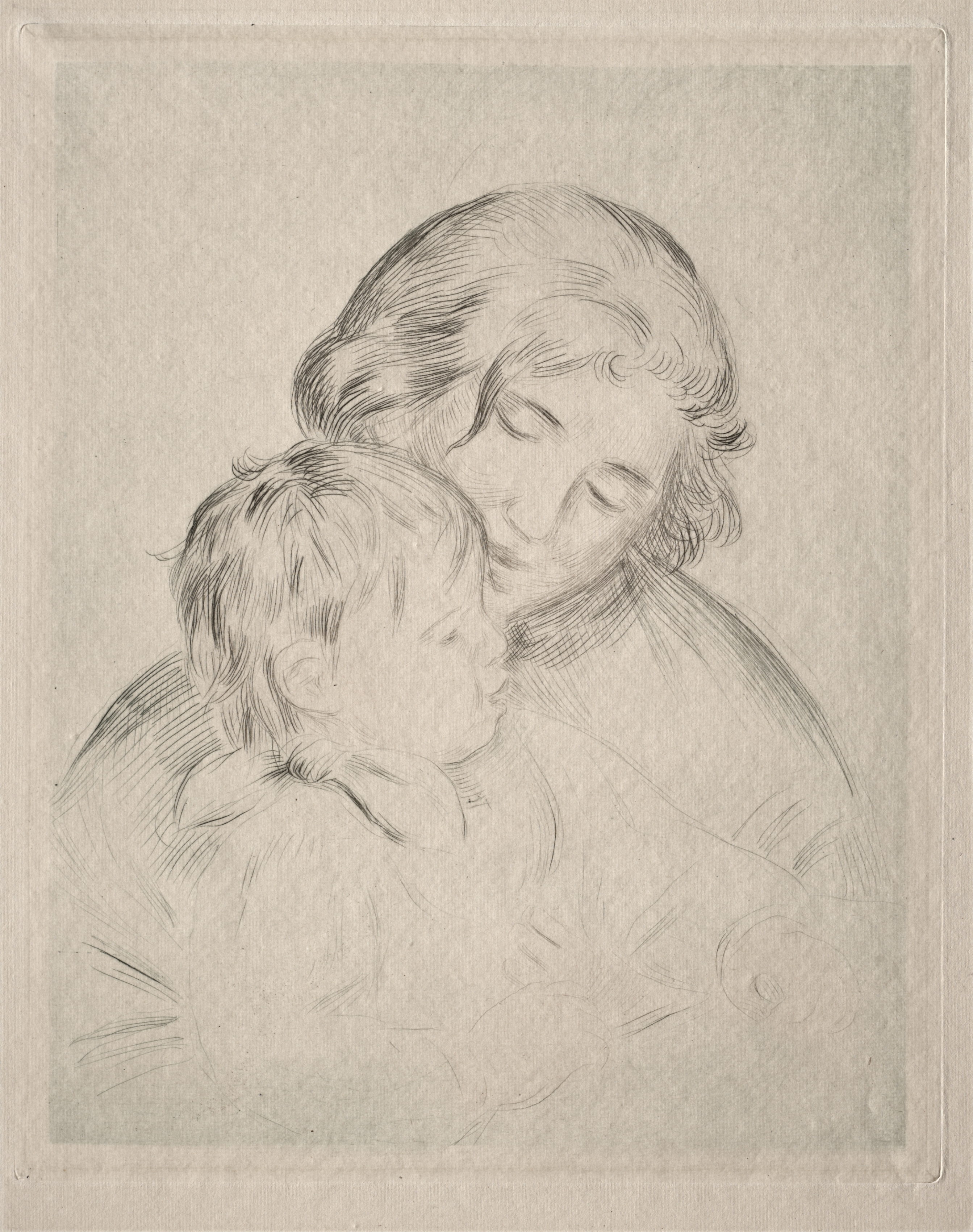 A pencil drawing on paper of an adult woman holding a toddler, both with their heads tilted. The woman's head is turned down and to the right with her eyes closed, her wavy hair parted down the middle. The child faces left with their head resting on the woman's shoulder and cheek. The woman wears a high necked garment with folds around the neck. The background is light gray with darker shading around the figures. The frame around the drawing is slightly darker with indented lines along the edges.