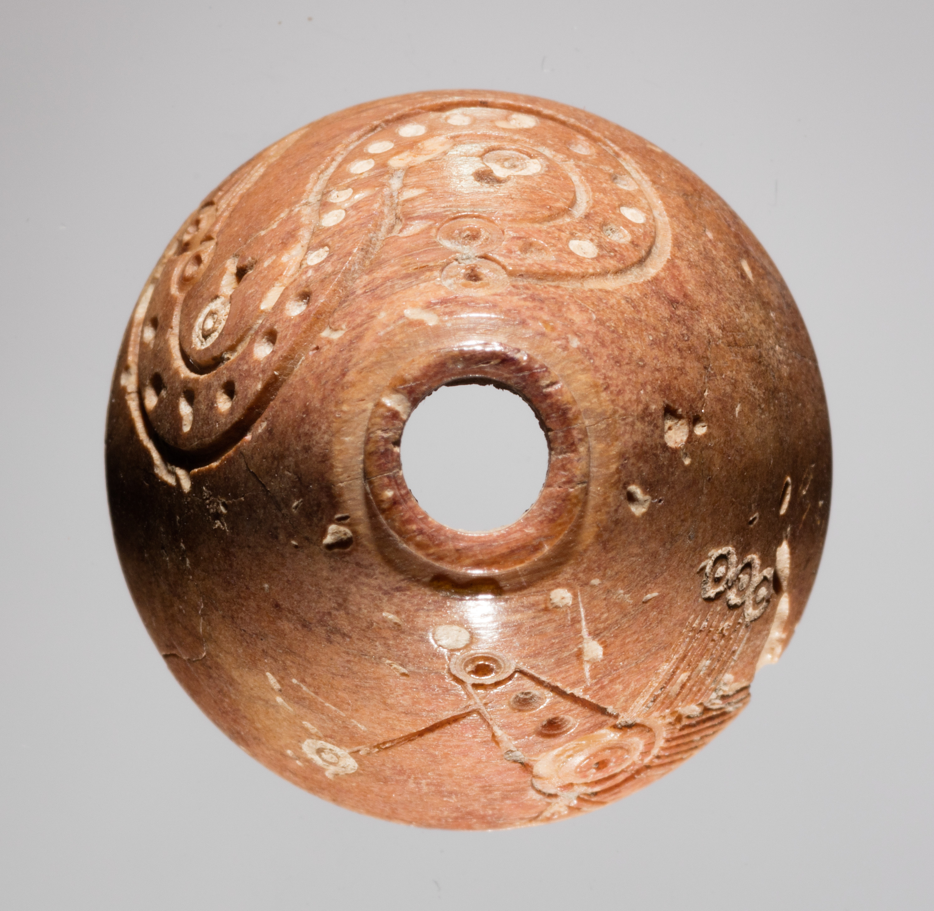 The object, titled "Spindle Whorl" by an unknown artist, is a spherical, reddish-brown artifact with a large circular hole through its center. The object has a smooth surface with visible scratches and marks. It features intricate, carved designs including swirling patterns and dots on its surface. The background of the image is a plain gray color.