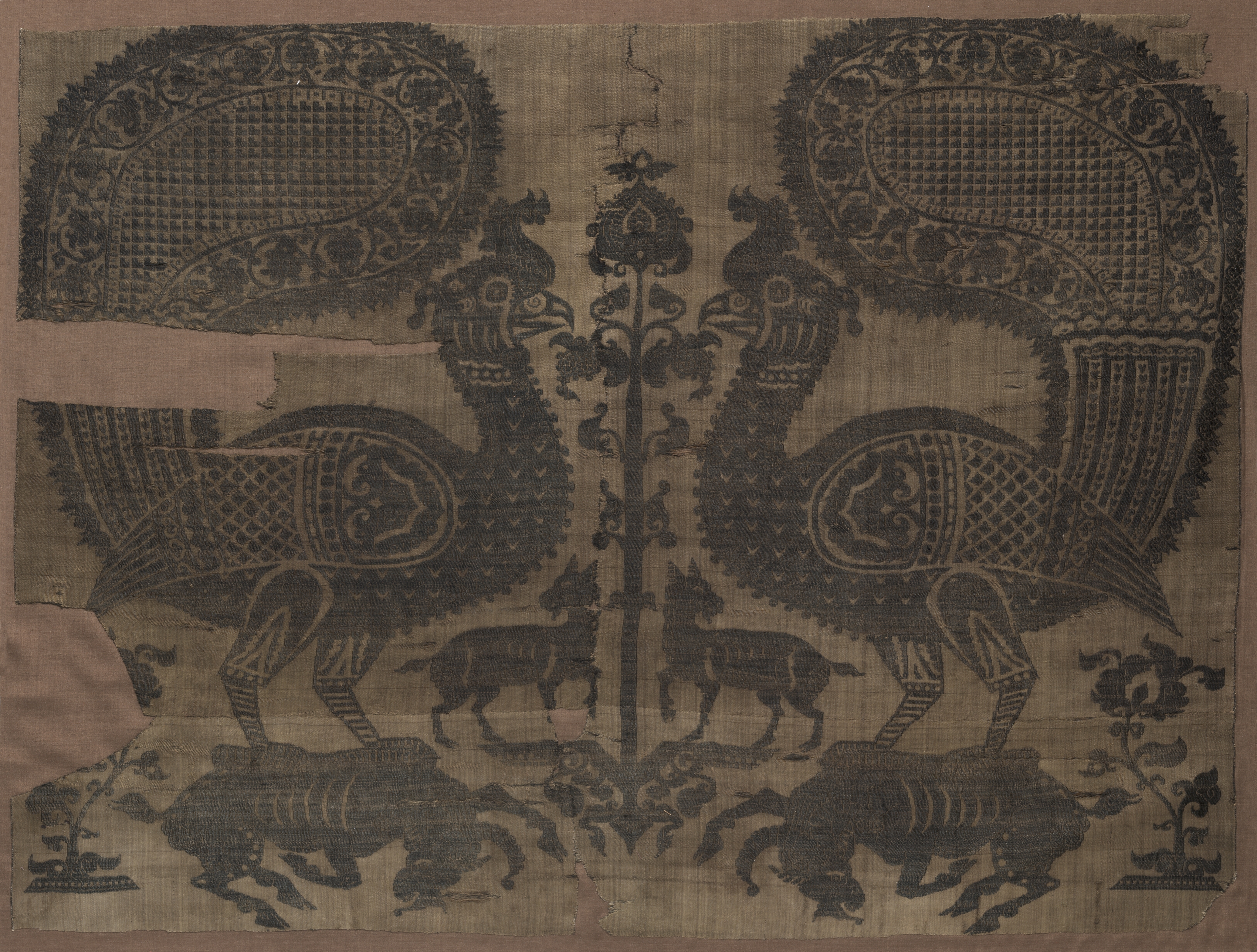 Brown fabric with dark brown designs. Two symmetrical teardrop shapes with floral patterns on top. Two identical animal designs underneath teardrop shapes with a small animal standing between the two. Two plant designs, one on each side. The bottom half features more animal designs.
