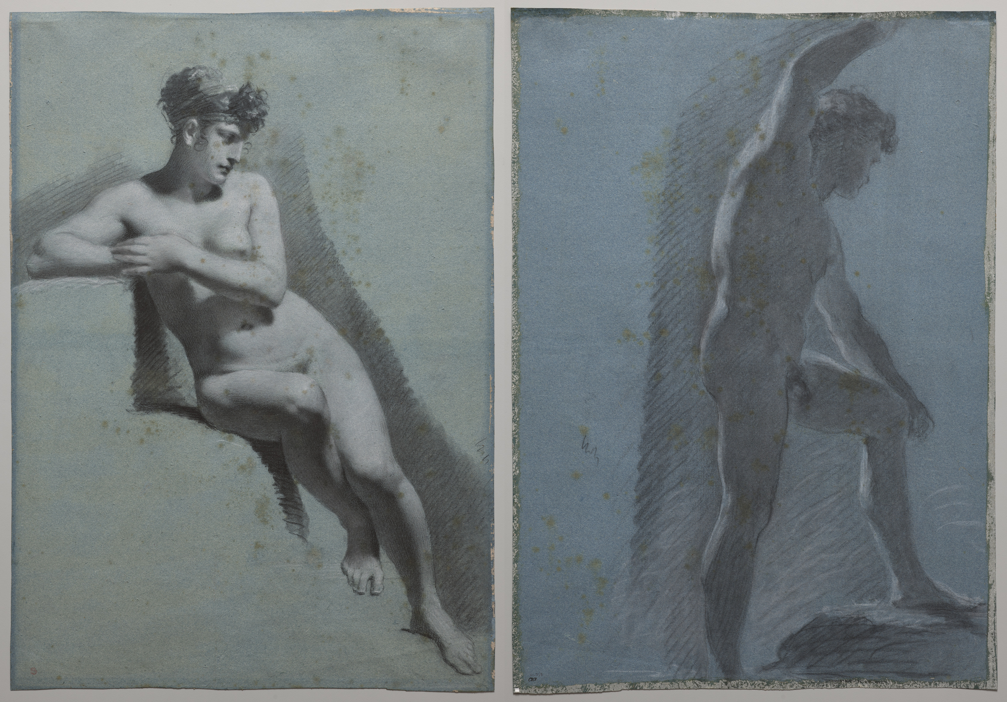 The image shows two sketches of nude figures. The left sketch depicts a woman with short hair sitting on a surface, leaning back with her right leg extended and left leg bent. Her arms are crossed over her chest. The right sketch depicts a man standing with one arm raised and the other resting on his thigh. The background of both sketches is grey-blue with darker shading behind the figures. The left figure faces right, the right figure faces right. The left figure's surface appears to be a ledge or a low wall. Both figures are drawn in shades of grey. The sketches appear to be done in pencil or charcoal. The background behind the sketches is white. The sketches are side-by-side.