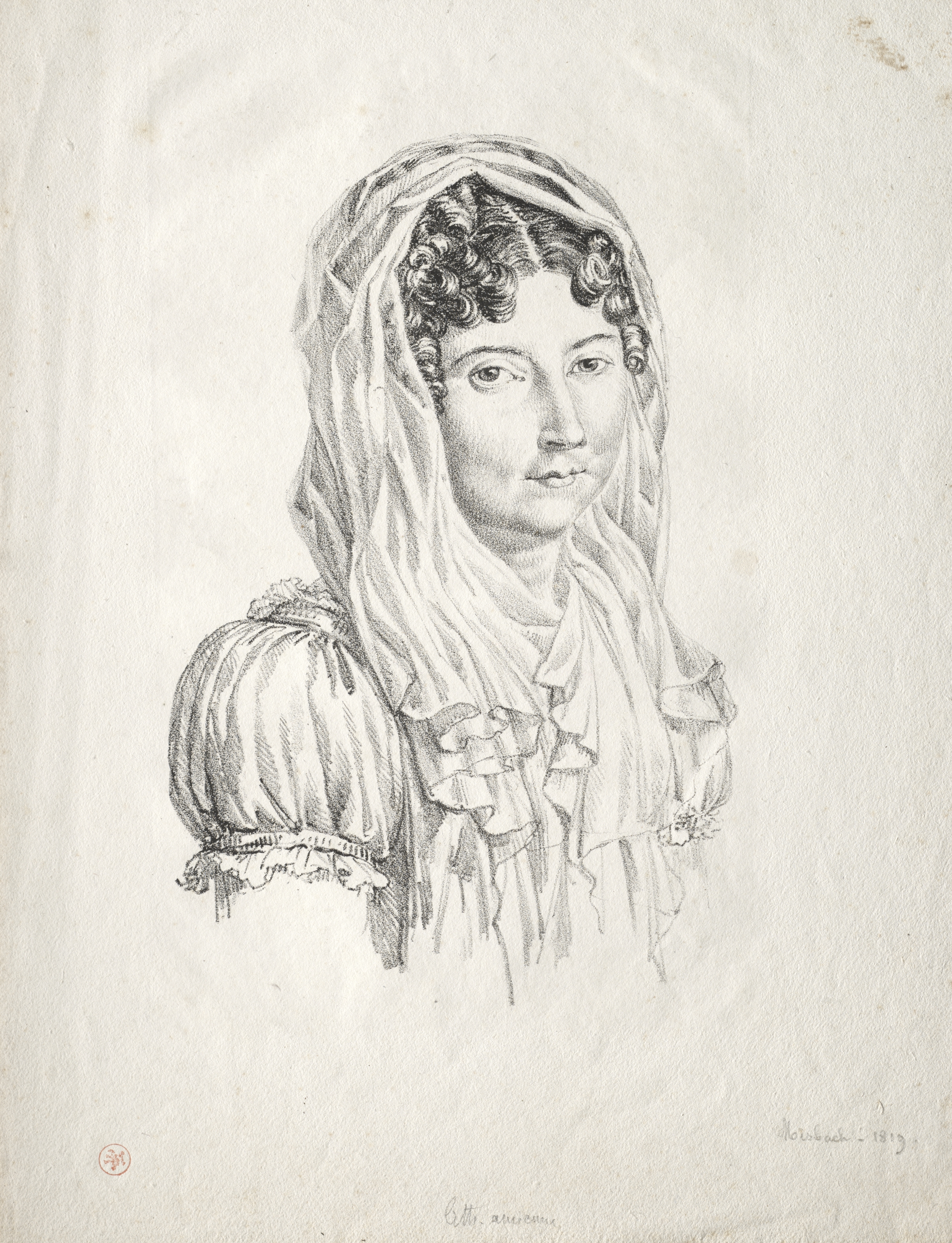 Portrait of a woman by Moisbach, a black and white drawing on off-white paper. The woman has curly dark hair, mostly covered by a light-colored headscarf. Her hair is curled on the sides, framing her face. The woman's eyebrows are thin and straight. Her eyes are medium-sized, and she is looking to her right. Her lips are thin and pressed together. She wears a dress with puffy sleeves that have ruffles at the bottom. The dress also has a ruffled collar. The drawing is signed in the bottom-right corner. There are some small illegible writings at the bottom. A small red circular stamp is on the bottom-left. The paper has some darker spots and lines.