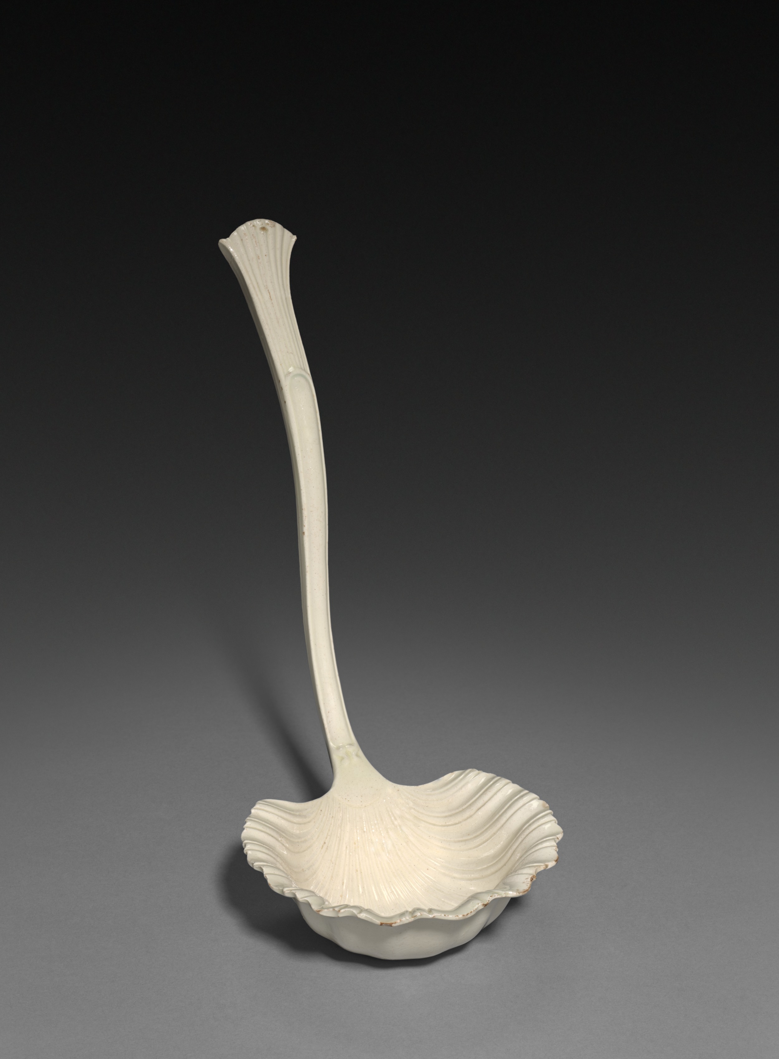 The ladle has a long thin handle that curves outward from the bowl. The handle is smooth and featureless. The bowl of the ladle is wide and shallow with a wavy rim. The ladle is off-white with a subtle sheen. The background is dark gray to black, transitioning from a light gray on the bottom left to black on the top right. A shadow falls to the left of the ladle. The ladle, titled "Ladle", is by artist Simon Leach.
