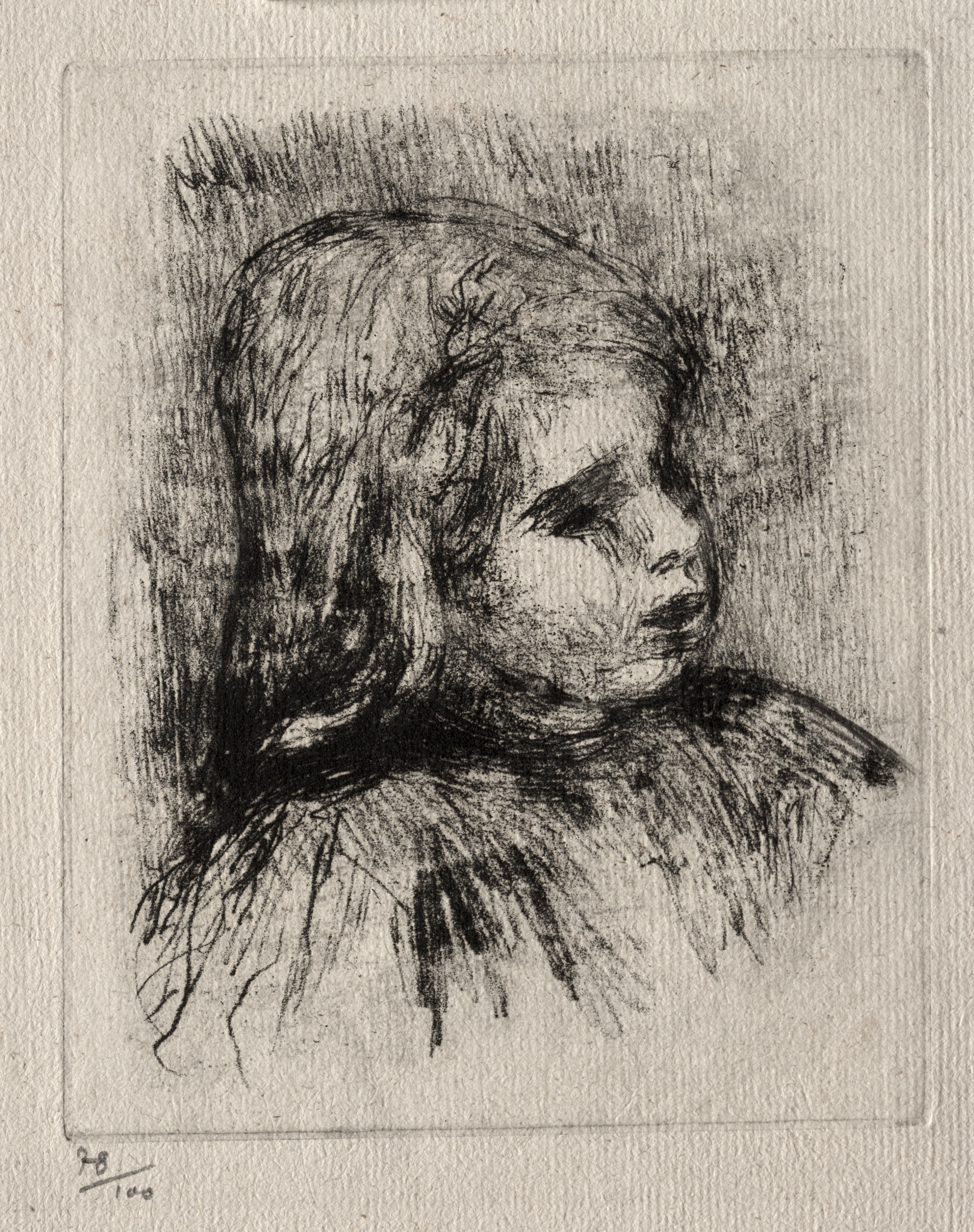 Black and white sketch of a child's head and shoulders. The child has long hair and is turned to the right. The background is shaded with darker areas around the child's head. The child's facial features are defined with lines and shading. The image is on a textured surface, possibly paper. A small inscription is in the bottom-left corner. The overall style is impressionistic. Claude Renoir, de trois-quarts à droite by Pierre-Auguste Renoir.