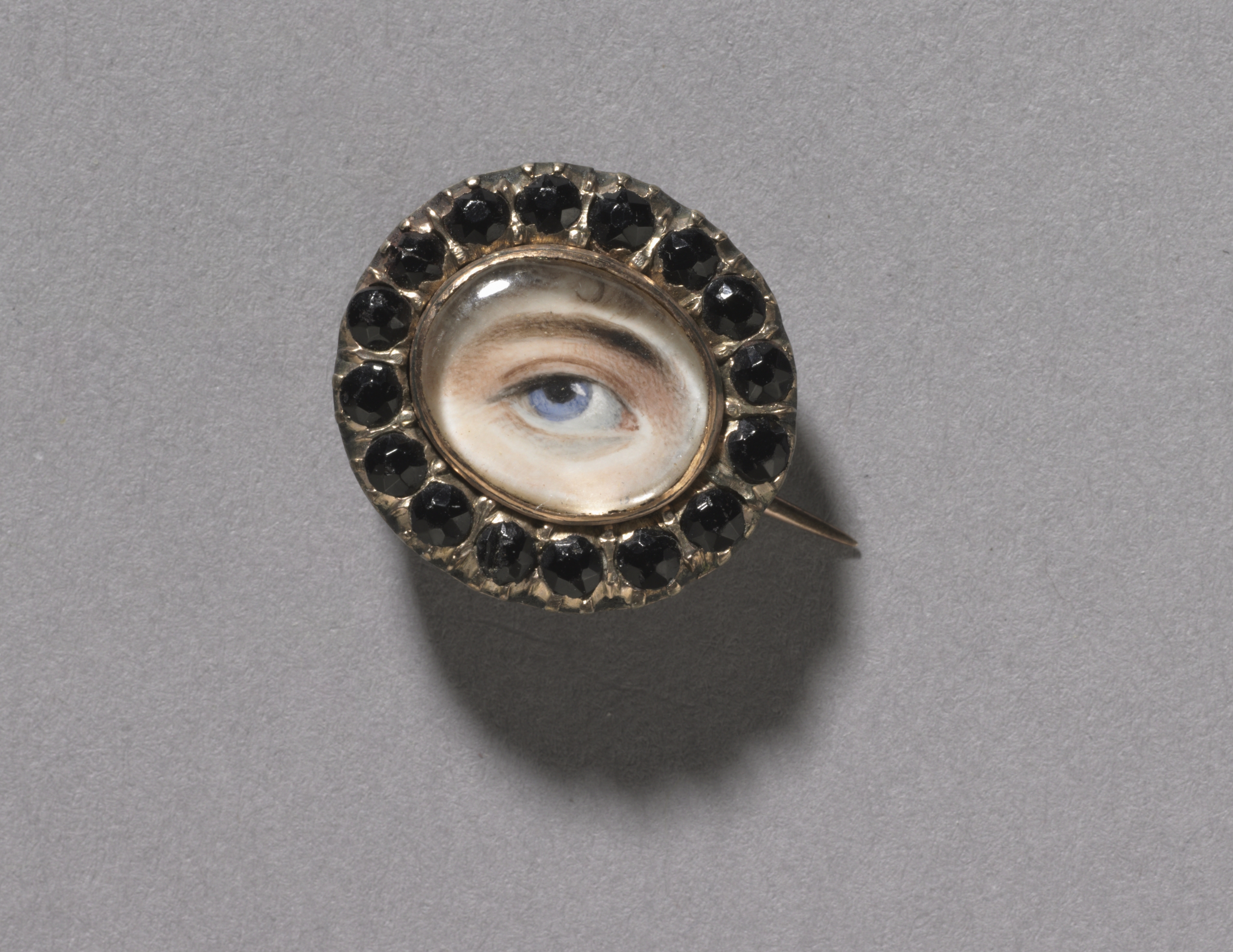 Gold brooch with a pin on the back, featuring a circular portrait of a blue eye on a white background, surrounded by a border of small black gemstones. The eye has a blue iris and white sclera, with brown details. The brooch is circular and has a textured gold setting. The background of the image is a plain gray surface. The title of the piece is "Eye" by the artist Augustus Saint-Gaudens.