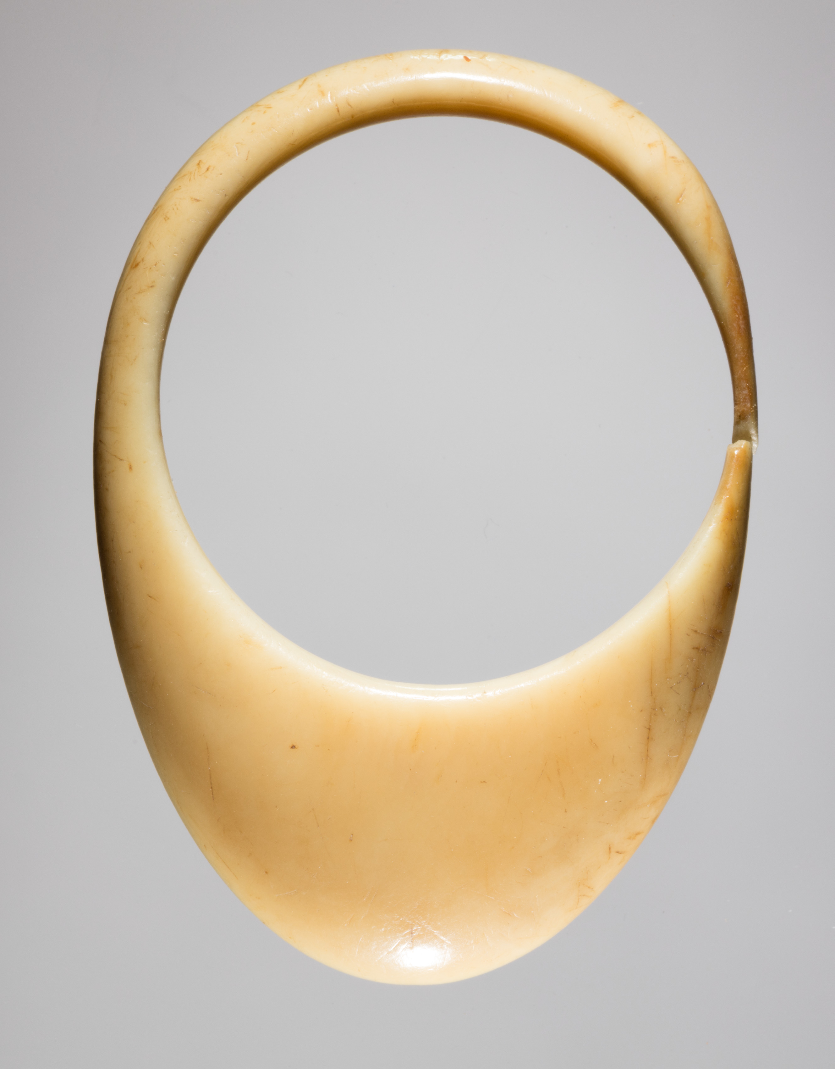 The object is a bracelet. It is made of a smooth, light yellow material. The bracelet is thick and rounded. It has a smooth shiny surface with minor scratches. The bracelet does not close completely. The background is gray. The bracelet is by artist "Ring".