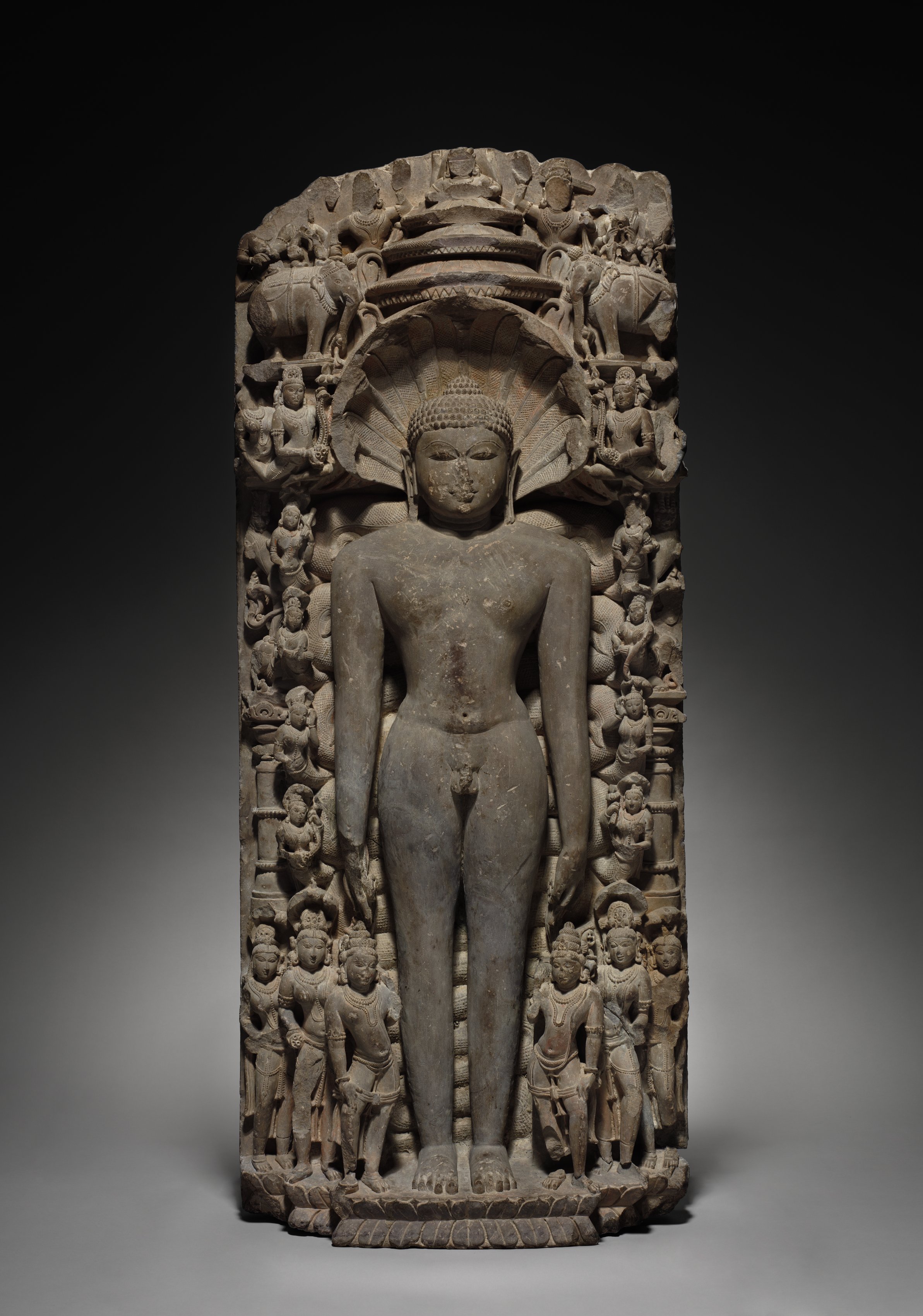 The sculpture depicts Parshva, a figure with a serene expression and closed eyes, standing in a relaxed pose. The figure is nude, with hands by the sides, and a distinctive hairstyle. The body has a natural, subtle curvature. The sculpture's surface is a mottled brown-gray color. Parshva stands on a decorative base, with feet slightly apart. The background of the sculpture features intricate carvings of various figures and animals, including elephants and people, arranged in a dense, ornate pattern. The top of the sculpture has a semicircular carving with a stylized design. Smaller figures are carved along the sides and back. The overall appearance suggests an ancient stone carving.