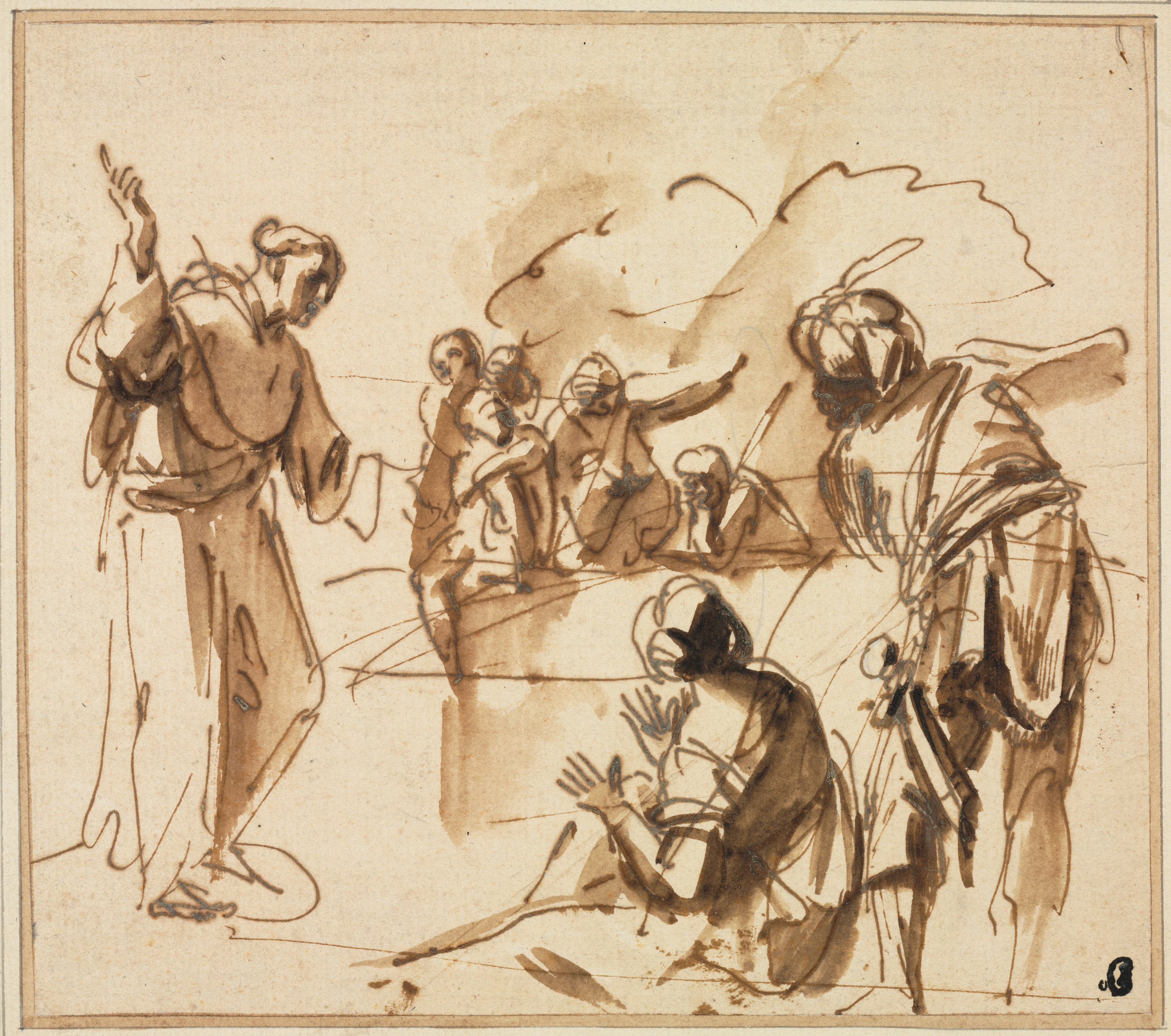 Brown and sepia drawing on aged paper. A monk on left with hands raised preaching to a group of people. Monks wears simple long pants and a robe. People are grouped on a platform and in front. People looking up to the left. A man on one knee in front. Others are gesturing. Darker brown stains around edges. A very thin line borders entire image.