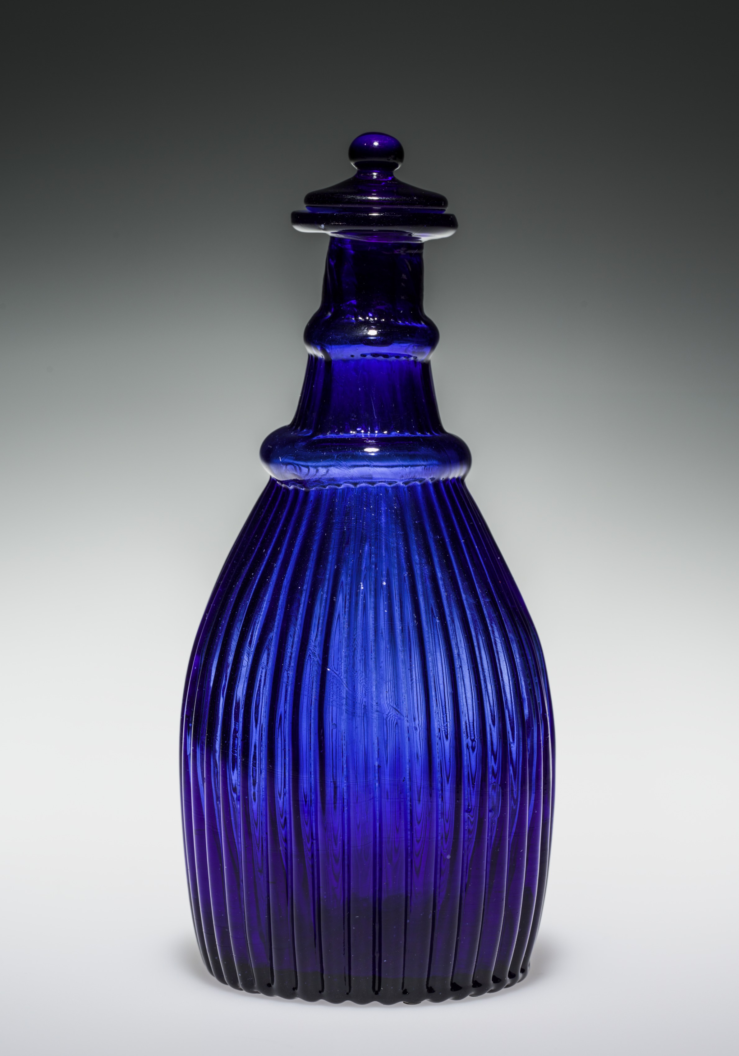 Cobalt blue glass bottle with vertical ribbing, a narrow neck and a small finial on the lid, by artist Baccarat.