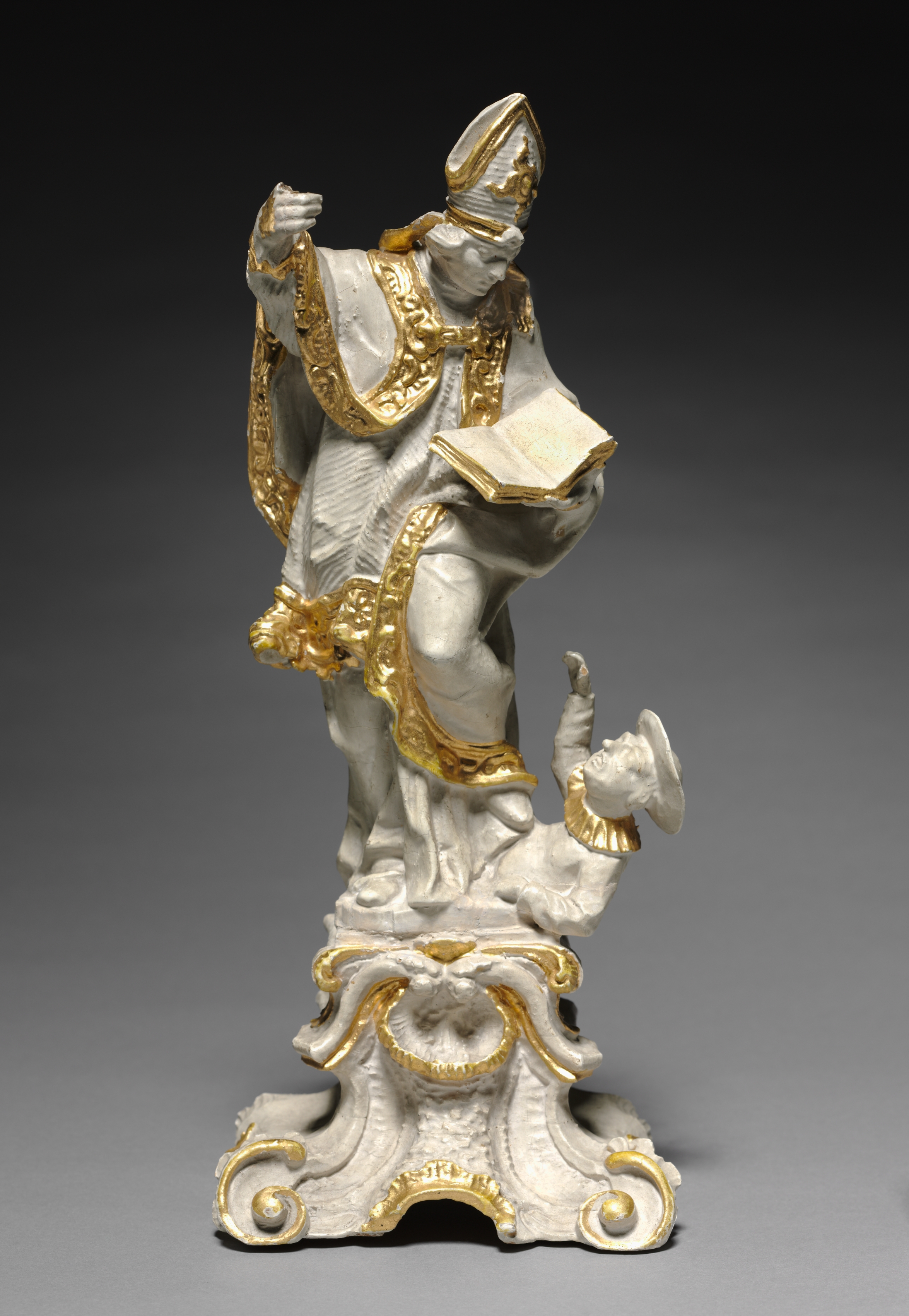 White statue of a bishop with gold accents. The bishop wears a mitre hat, holds an open book in left hand and right hand raised. He stands on right leg, with left leg bent behind him. Small figure at his feet. Statue on ornate base with scroll-like designs.