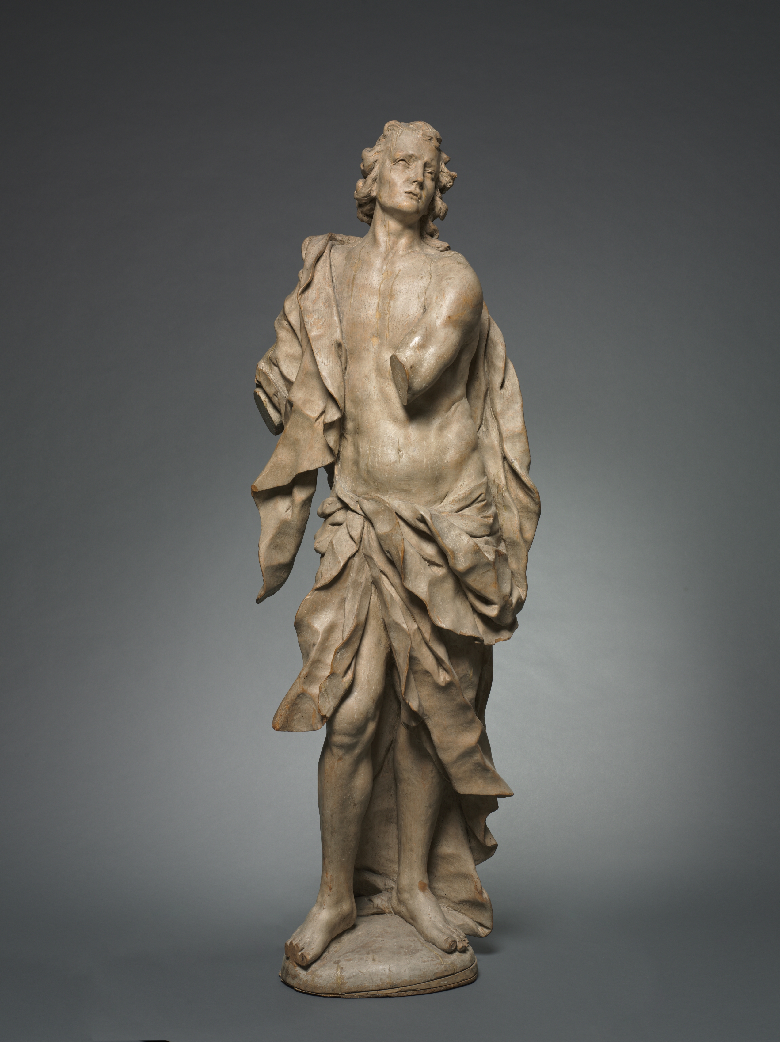 A sculpture of a man with long wavy hair, bare feet and chest, and a cloth wrapped around his waist and over his left shoulder; his right hand on his chest.