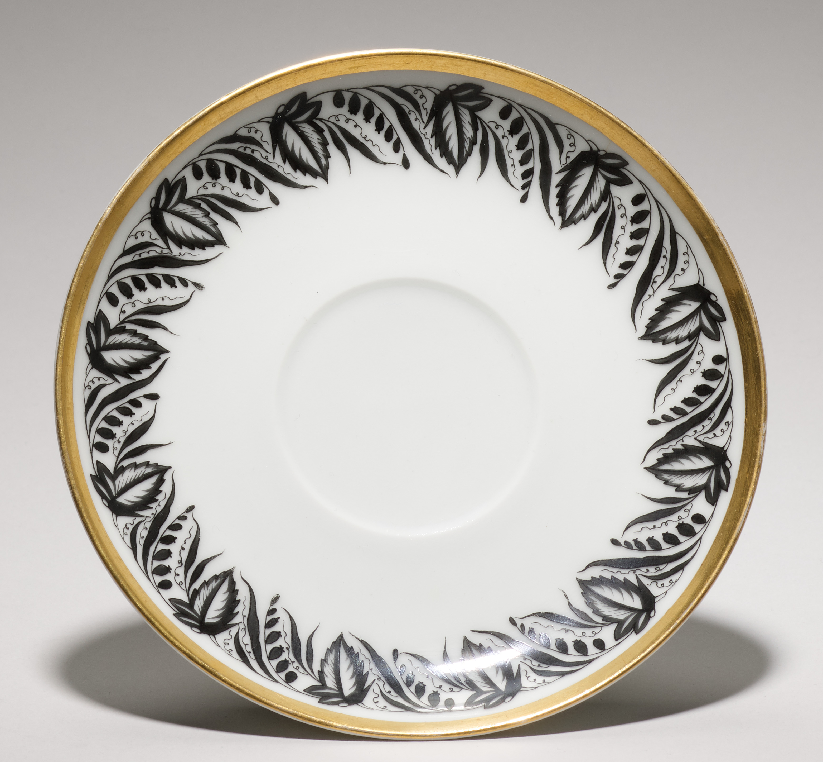 Round white porcelain saucer with a recessed circular area in the center. Black leaf designs decorate the rim on the inside. The rim of the saucer is outlined in gold. The background is gray and there is a shadow on the lower part of the saucer. The saucer is titled "Saucer" by St. Petersburg Imperial Porcelain Factory.