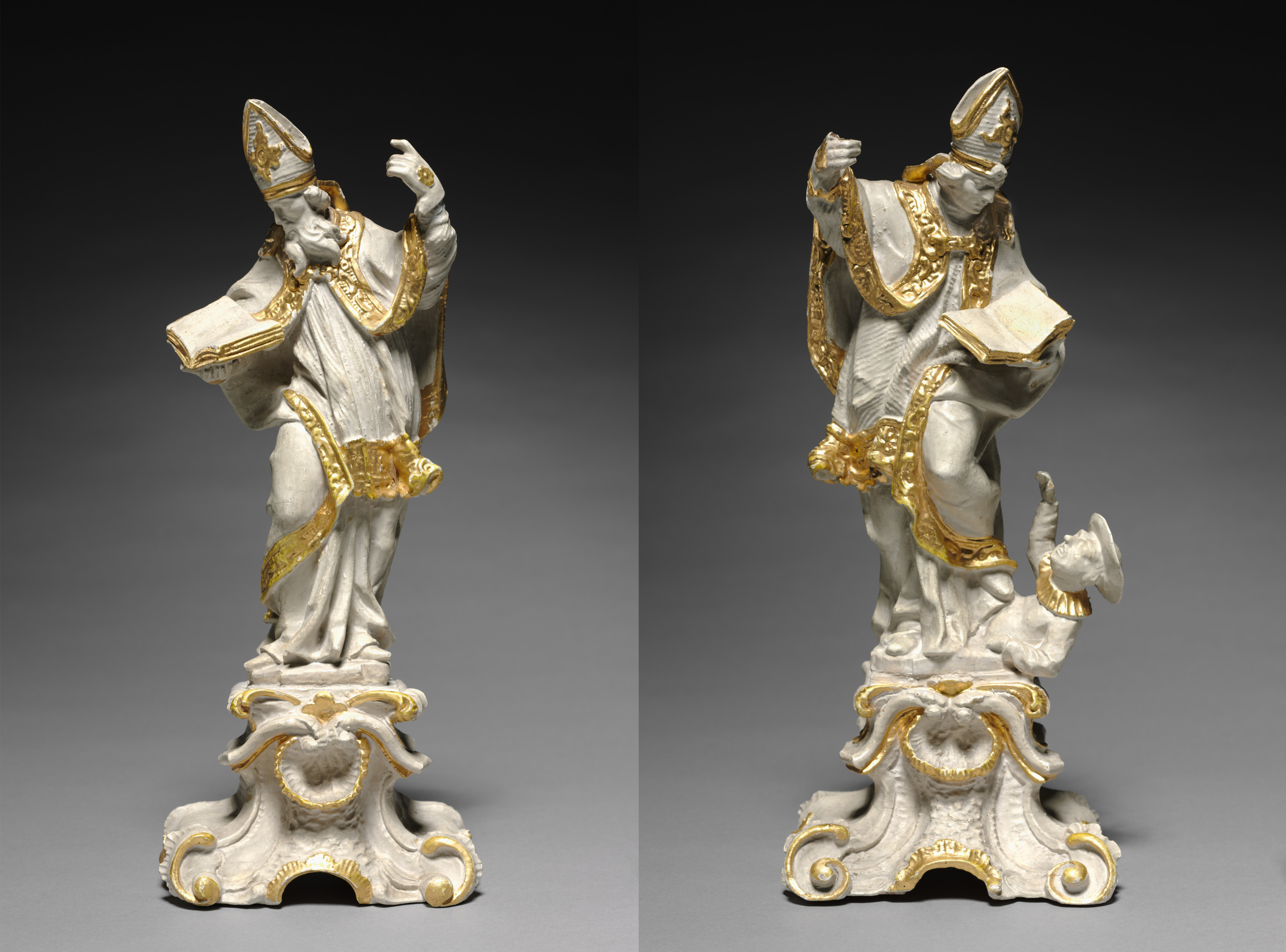 Two white and gold statues of a bishop saint. The statues are made of white material, possibly ceramic or porcelain, and have gold accents. The saint is depicted wearing a mitre hat. The statues are positioned on ornate bases with gold detailing. The saint on the left statue appears to have one arm raised and holds an open book in the other hand. The saint on the right statue holds an open book in one hand and raises the other. A figure of a man with a hat is on the base of the right statue. The background is dark gray to black. The statues are by Ferdinand Tietz and titled Bishop Saint Statuette Pair.