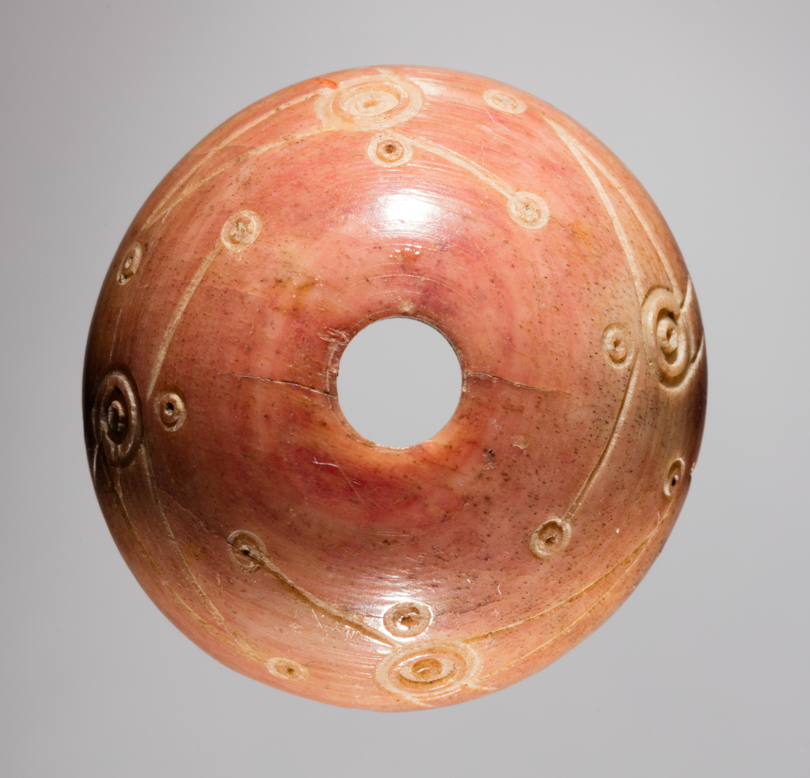 Spindle Whorl by unknown artist. A circular object with a round hole in the center, made of pinkish-red stone. The object has a glossy appearance. The surface features various carved designs, including curved lines, spirals, and small circles. The background of the image is gray.