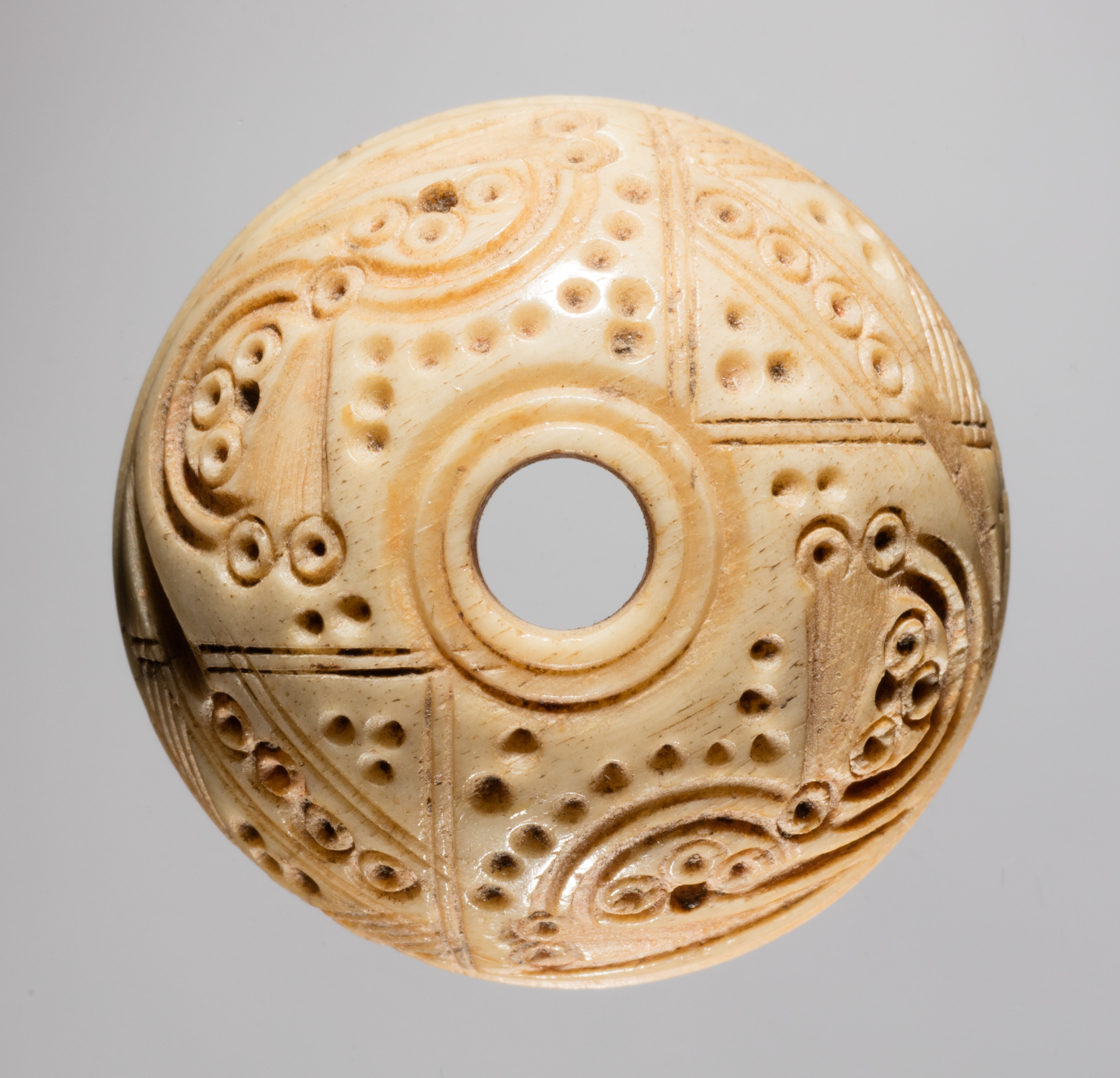 Round, light-colored object with a hole in the center, made of bone or ivory. The object has a smooth surface with various carved designs including dots, lines, and swirls. The designs are symmetrical and divided into sections by lines. The object resembles a spindle whorl, which is a type of artifact used in ancient times for spinning fibers.
