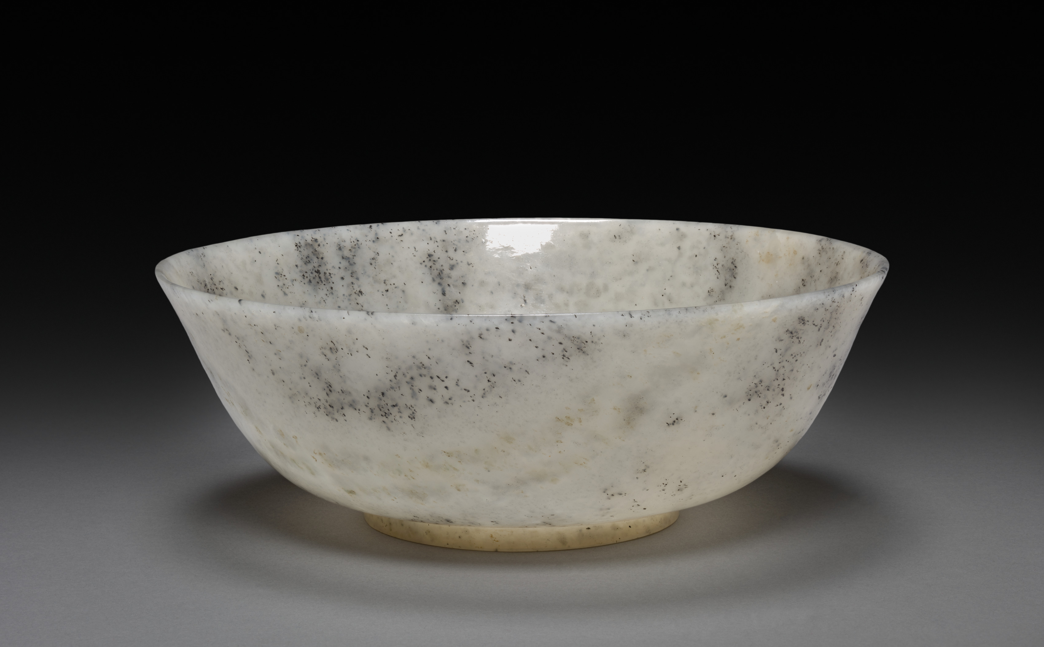 The bowl "Bowl" by an unknown artist is white with gray and beige flecks throughout, made of stone, with a wide mouth and rounded body that tapers to a small circular base, smooth exterior surface with some darker spots. The inside is smooth and shiny. The background is dark at the top and lighter at the bottom with the bowl casting a shadow.