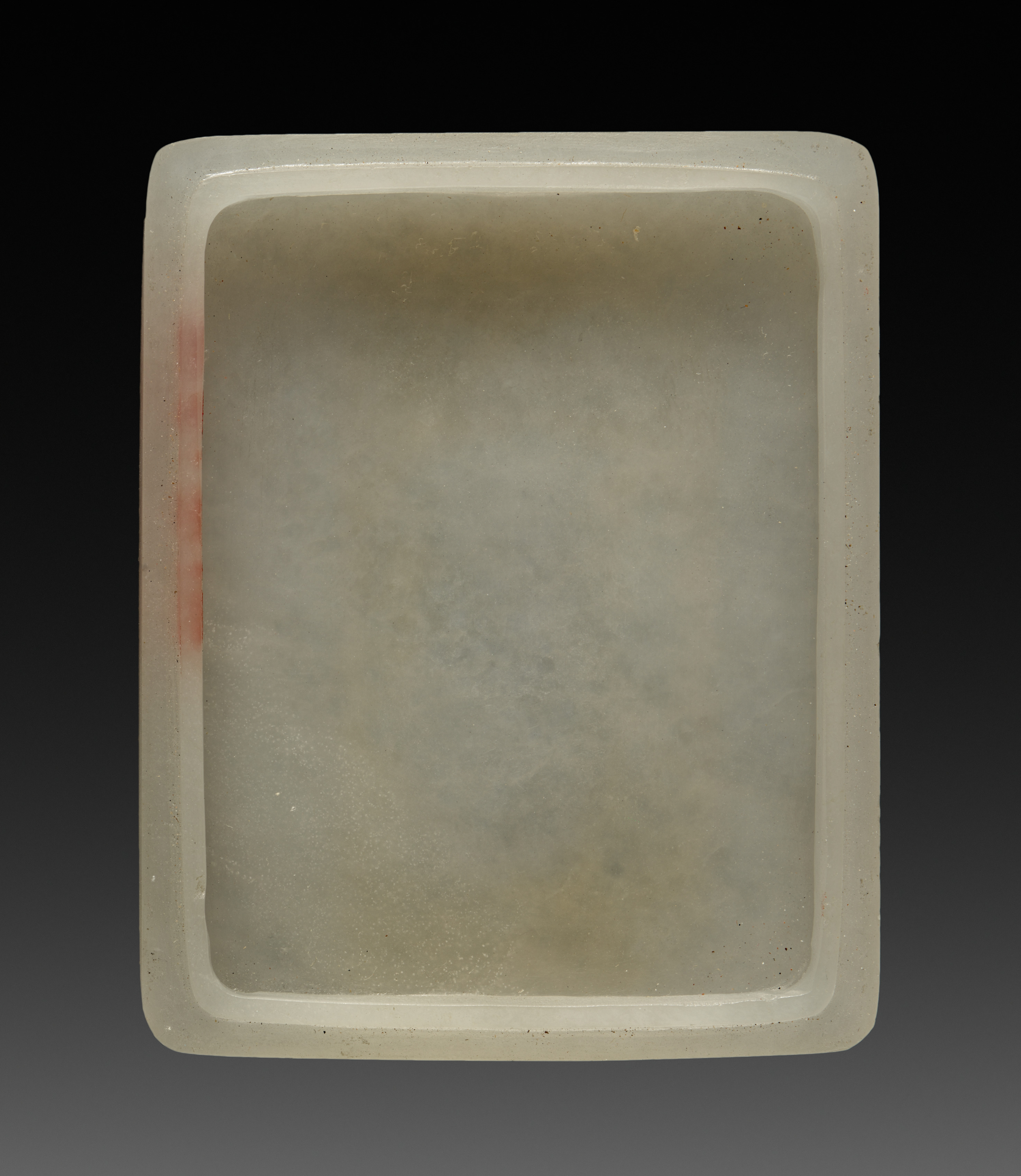 Seal Box by Artist. Square object with rounded corners and a recessed interior. The object is made of white material with a smooth surface. A small red mark on the left side. The object has a raised edge around the perimeter. The background is black.