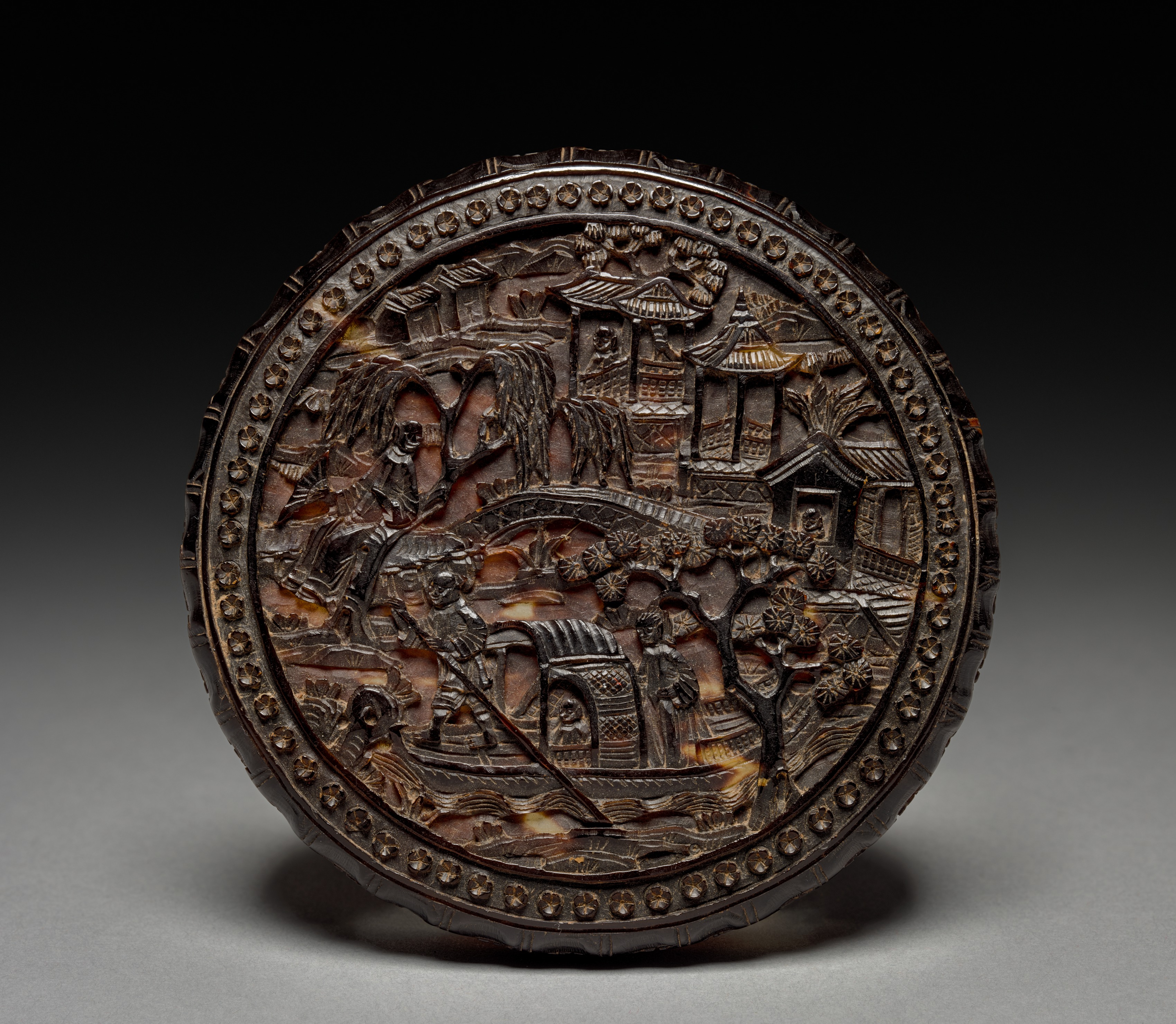 Dark brown circular fragrance box lid with intricate carvings. The lid features a raised design depicting a village scene, including several small buildings with tiled roofs, trees, people, and a bridge over water. The outer edge of the lid has a decorative border of small circles and a row of short lines. The inner edge of the lid features a border of small flowers. The background is dark at the top, transitioning to light gray at the bottom.