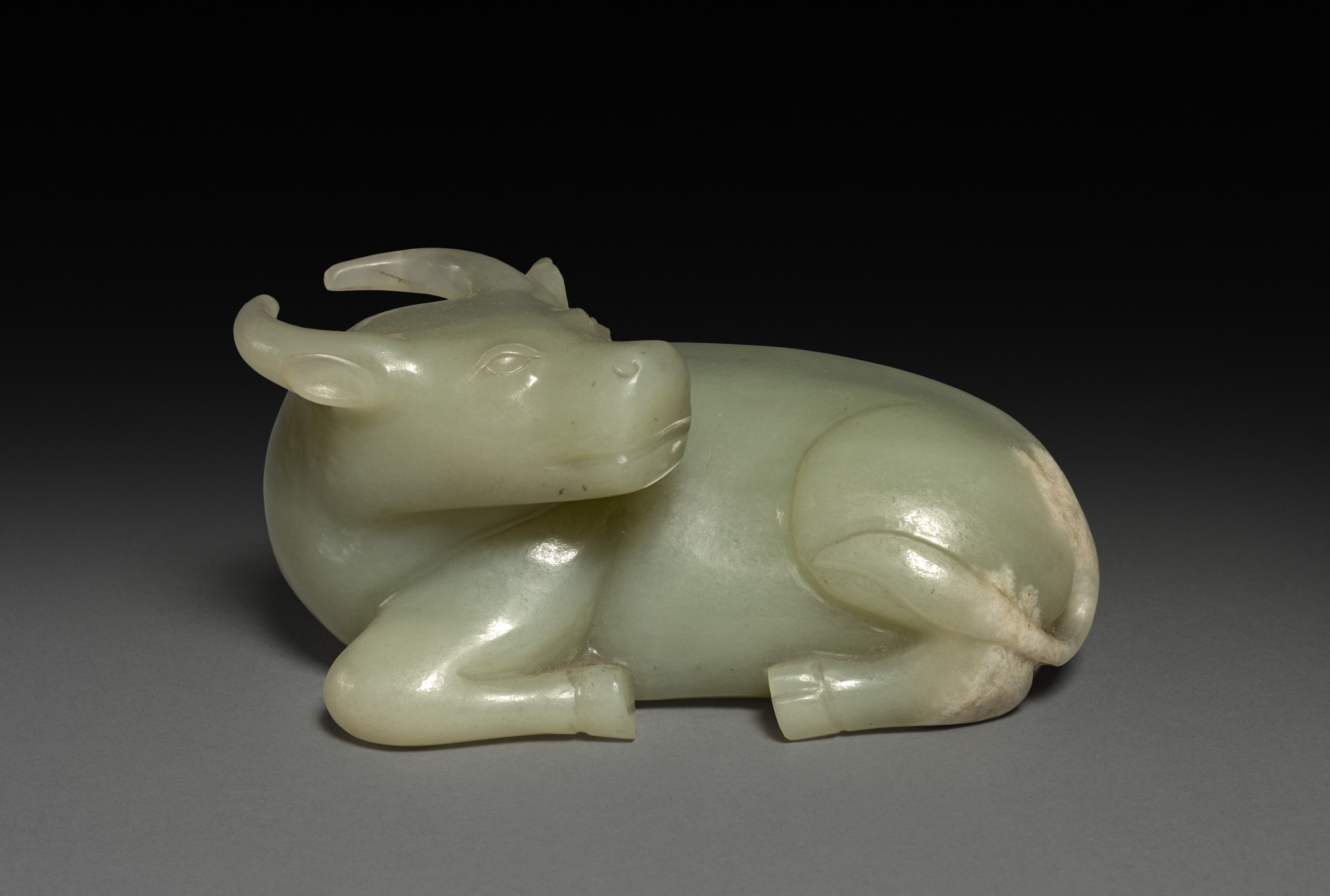 Reclining Water Buffalo by unknown artist. The sculpture depicts a reclining water buffalo. The buffalo is carved from a light green stone, possibly jade, and has a smooth, glossy finish. It lies on its stomach with its front legs bent under its body and its back legs tucked underneath. Its head is raised, and it has small, curved horns on top. The eyes and nostrils are visible. The background is dark gray to black, with a slight shadow cast by the sculpture.