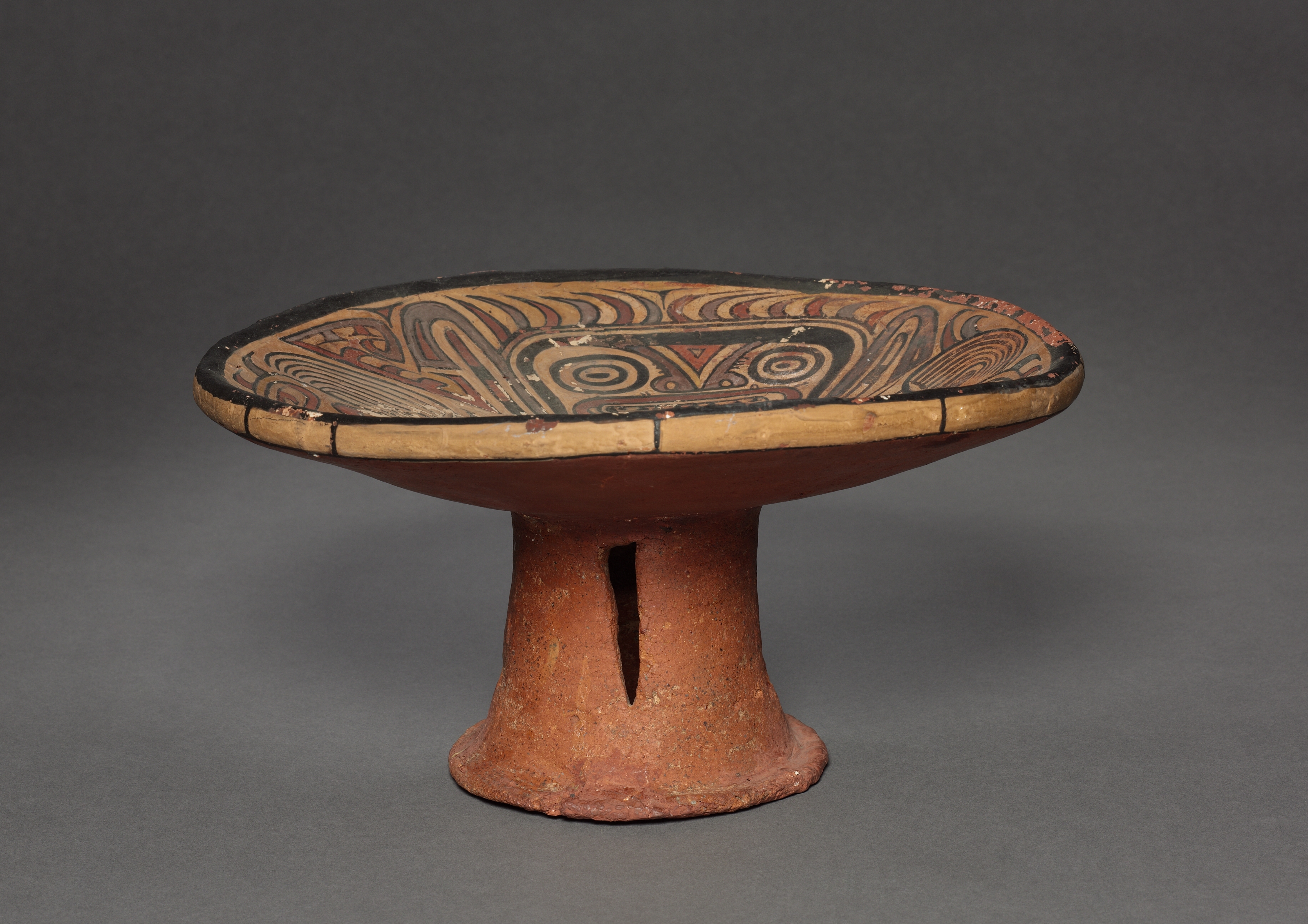 The Pedestal Plate by artist is a ceramic object with a wide, shallow bowl-like top and a narrow, short stem. The top is flat and wide with a decorative design on the inside. The design features various curved lines and shapes in shades of brown, black, and red. The outer rim of the top is a light brown color. The stem is a reddish-brown color and has a narrow vertical slit in the front. The background of the image is a solid dark gray color. The object appears to be an ancient or antique piece, possibly from a museum or cultural collection. The overall shape resembles a pedestal or a stand with a plate on top. The material appears to be terracotta or clay.