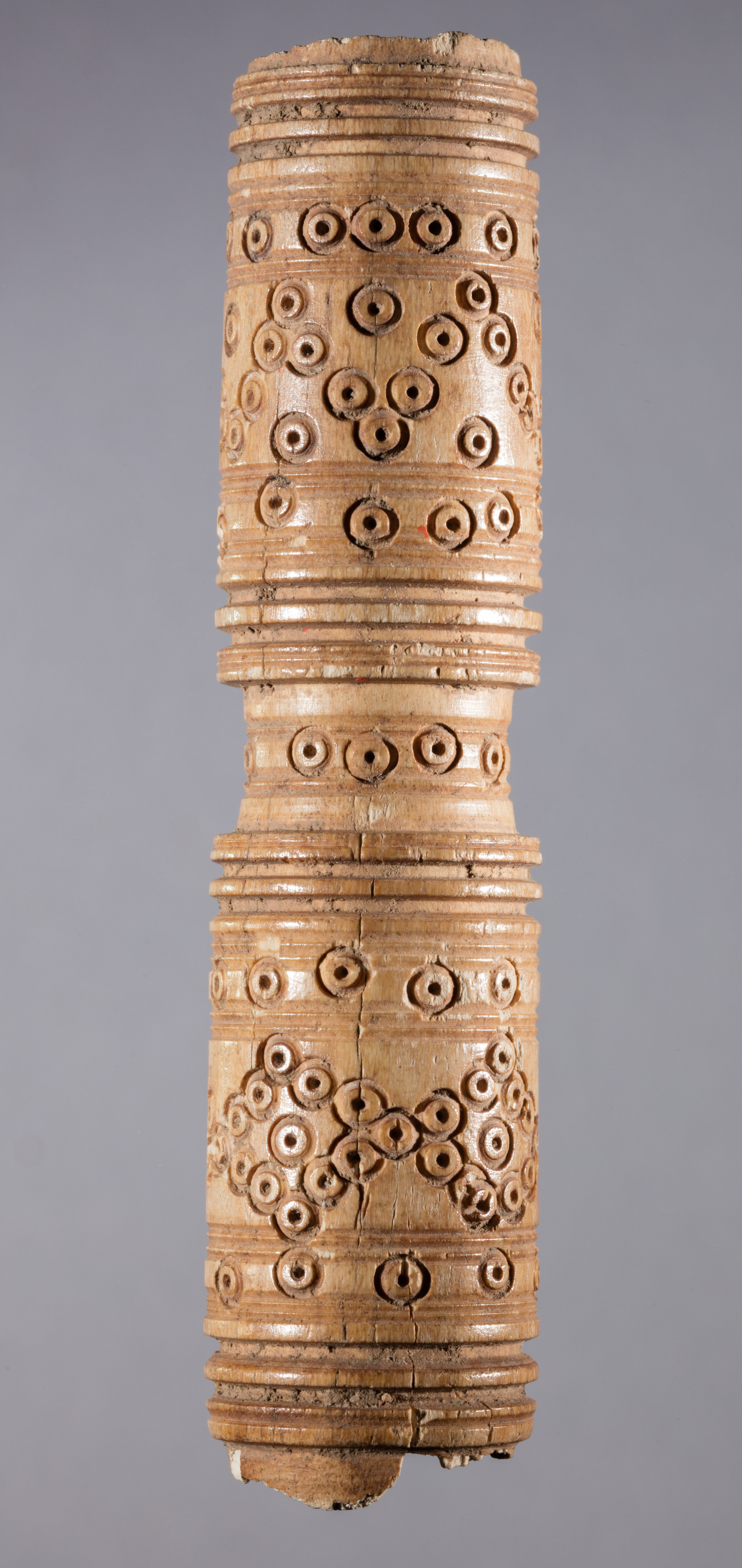 The artwork, titled "Hollow Tube" by an unknown artist, shows a cylindrical object with a light brown color. The object features a series of ridges and grooves along its length. Small circular patterns are carved into the surface, arranged in rows and shapes. The top and bottom of the object are not perfectly flat, with the top appearing slightly uneven and the bottom having a small protrusion. The background of the image is gray.