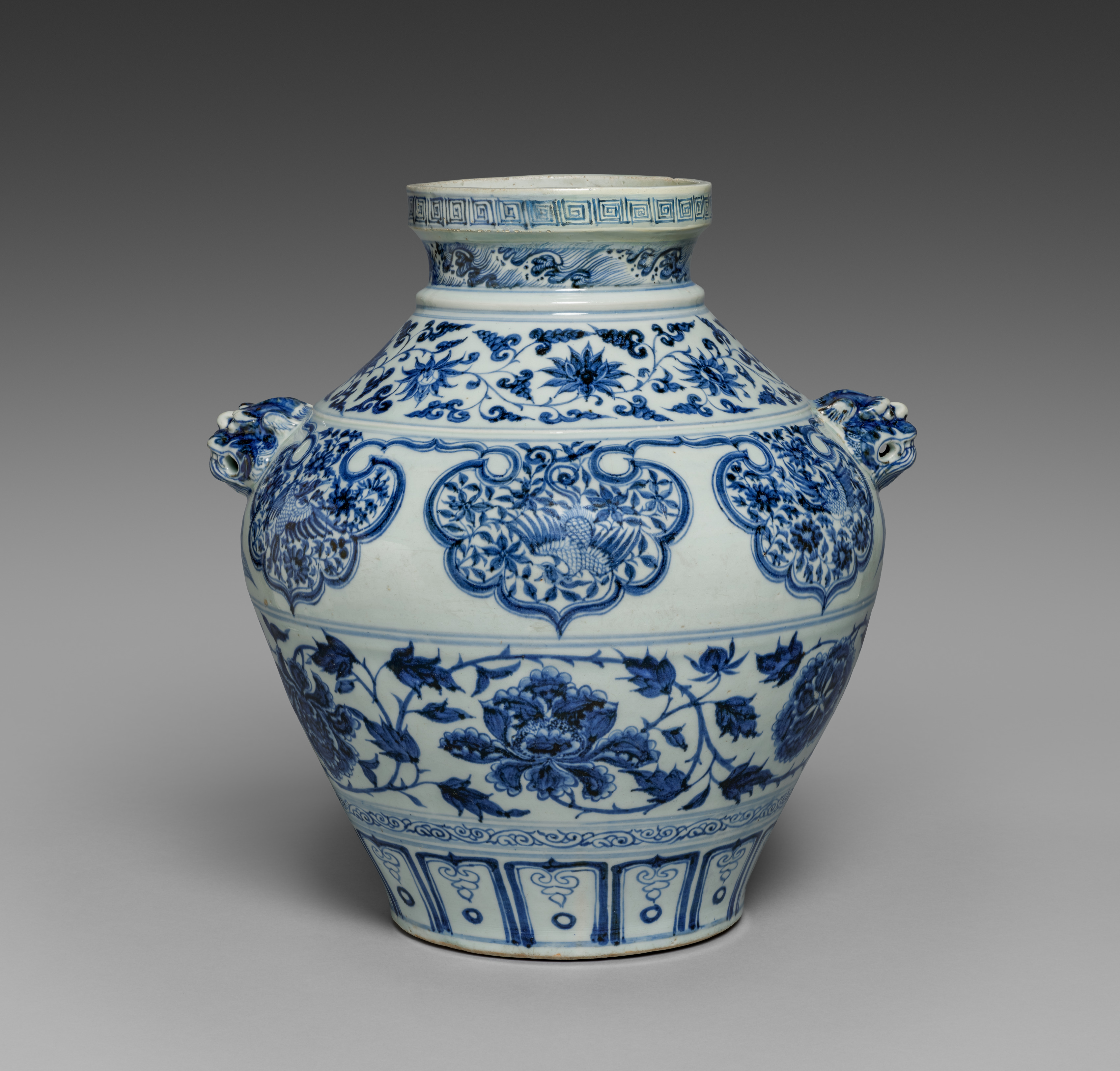White vase with blue floral designs; short wide neck; wide body; two handles on either side shaped like lions' heads; designs on body include birds, scrollwork, stylized flowers; designs on neck include keyfret patterns; geometric patterns on lower body. Jar with Lion-Head Handles.